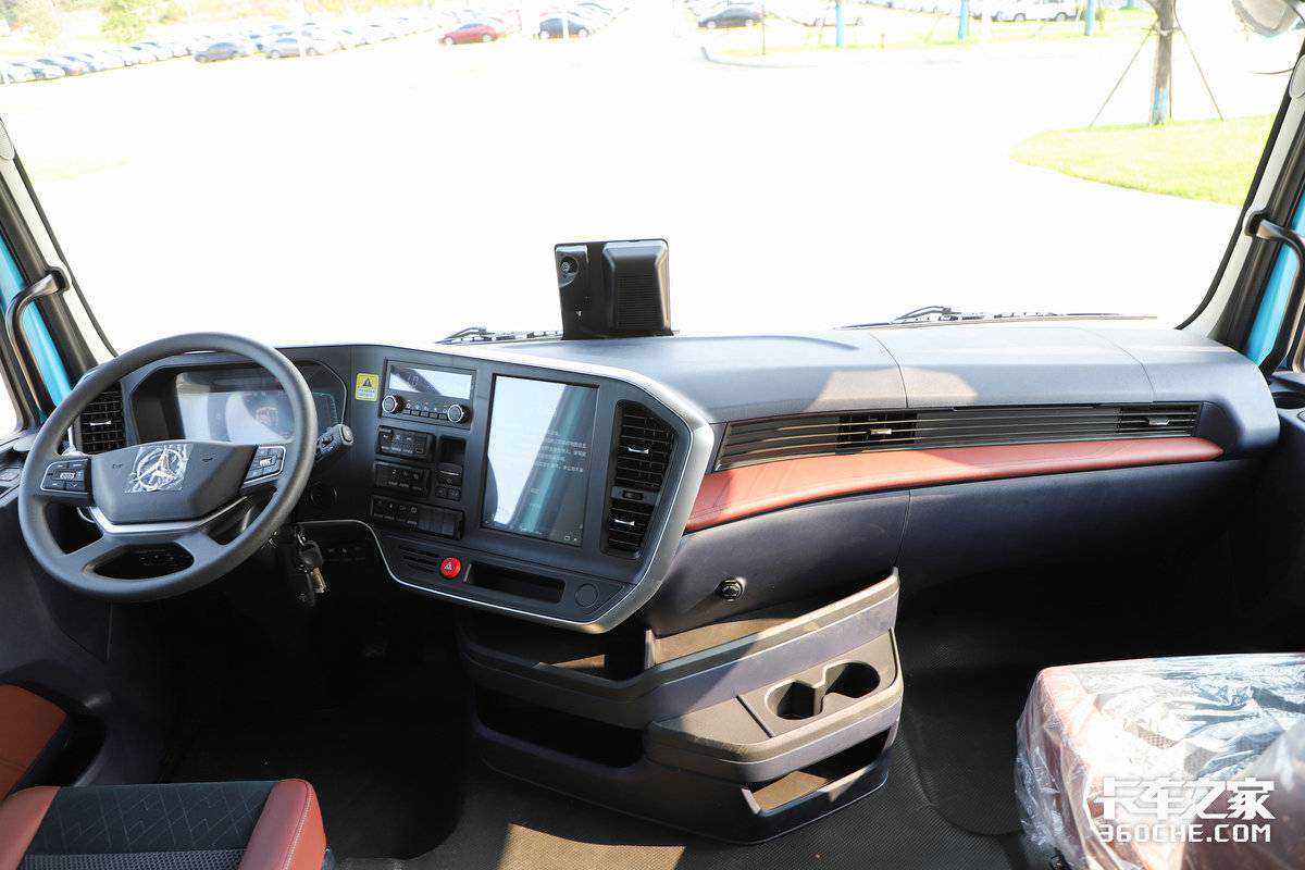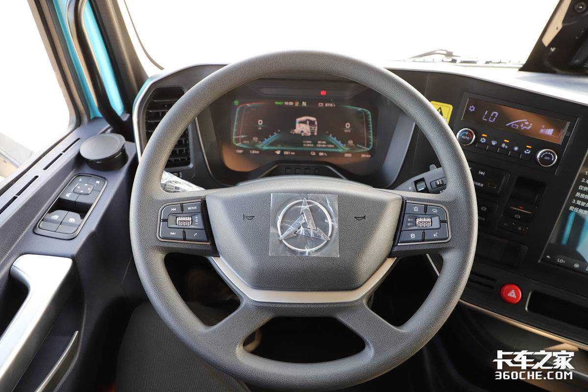 实拍车辆采用四点全浮气囊结构驾驶室,气囊直径为140mm,而且悬置配备3个高度阀,可以根据路面震动自动调整气囊气压,配合一体式气囊减震座椅,可以极大地降低司机驾驶时产生的疲劳感。