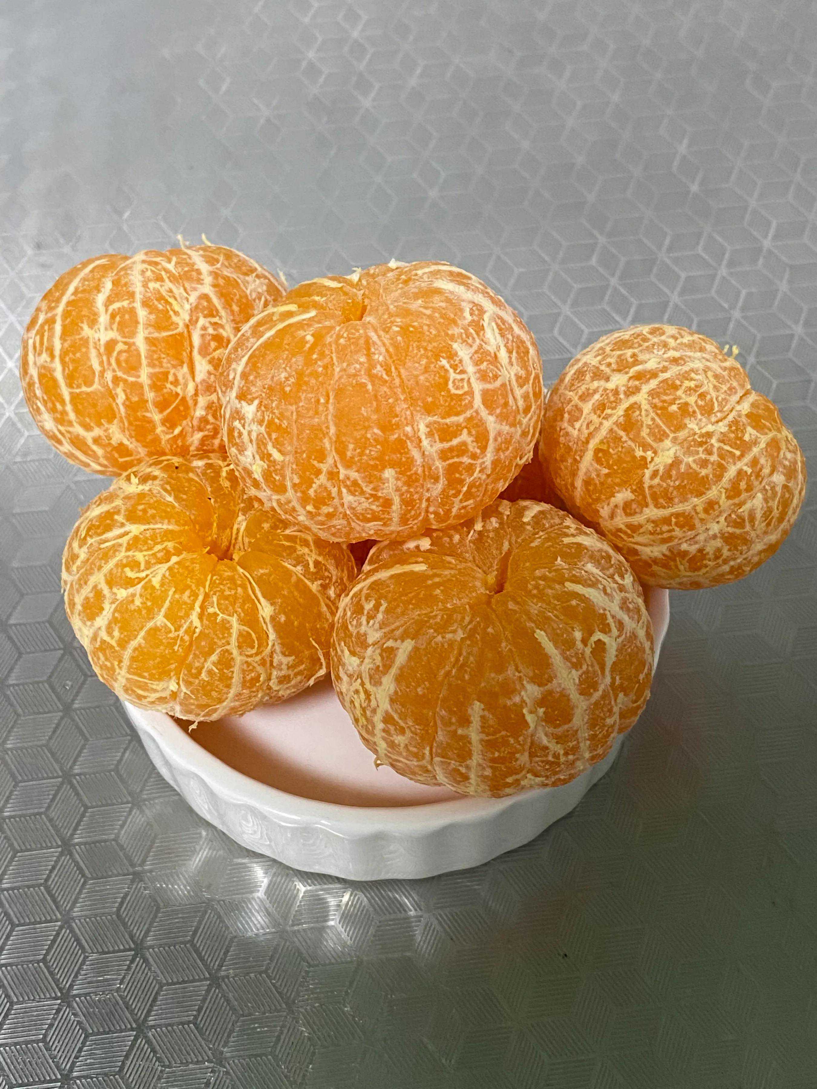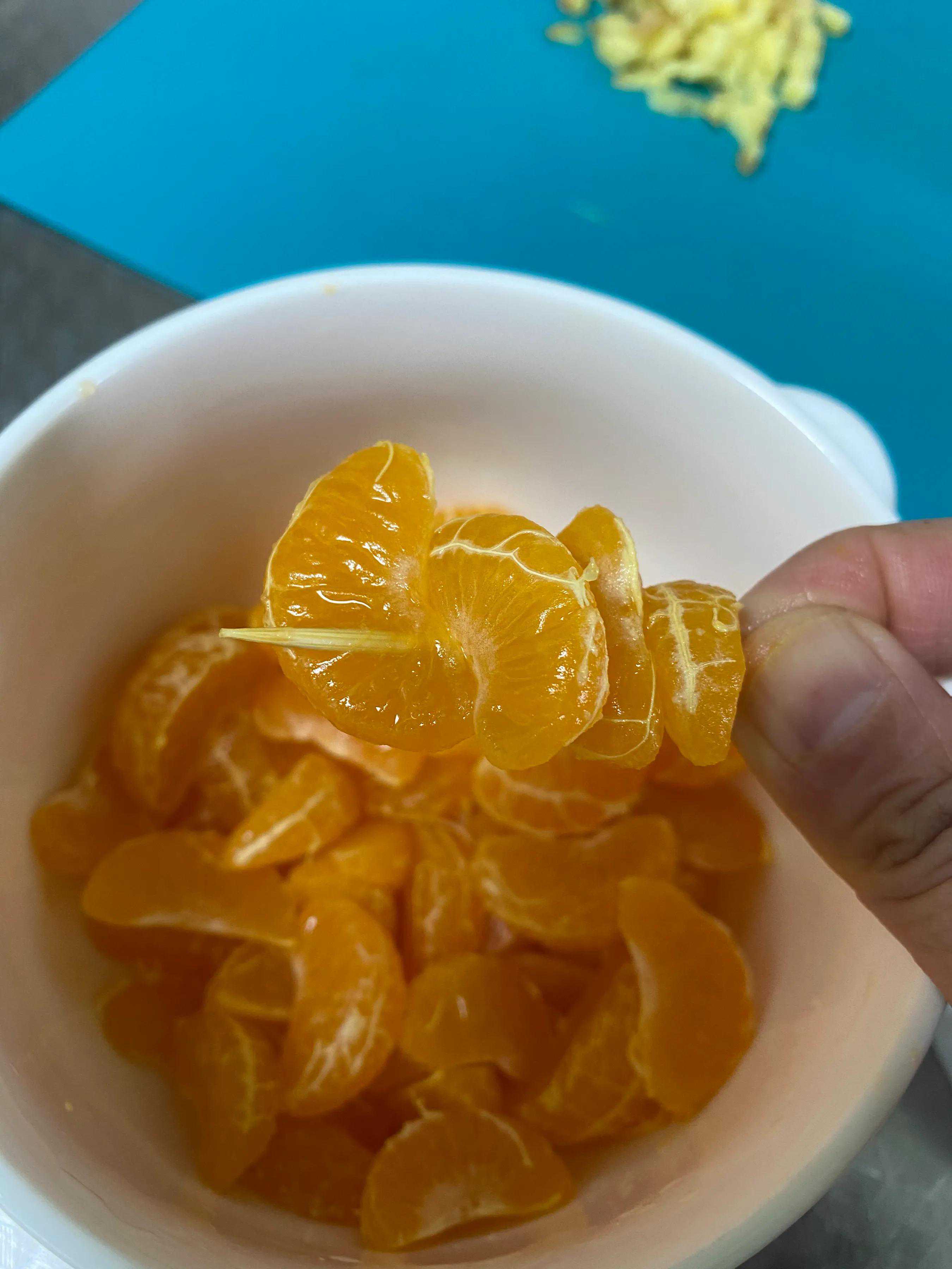 看到了没?重点就在这一颗颗的小桔子。去皮,然后用牙签在桔瓣上多扎几下,让果肉形成小洞!