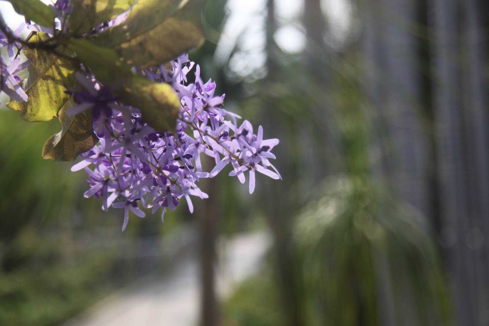 仔细观察它的花朵,总状花序由侧枝枝梢分开,浅蓝色花萼5裂形似花瓣,真正的花朵位于中心较小呈紫色。虽然蓝花藤的花朵不大,但是花朵盛开时的壮观场景,令人让人难忘。