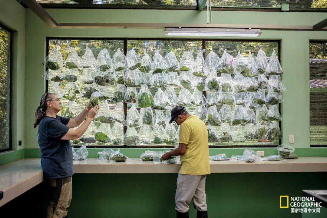 在哥斯达黎加拉塞尔瓦研究站,装着叶片的袋子组成的“动物园”里生活着数百只毛虫,以及它们体内的寄生蜂卵。