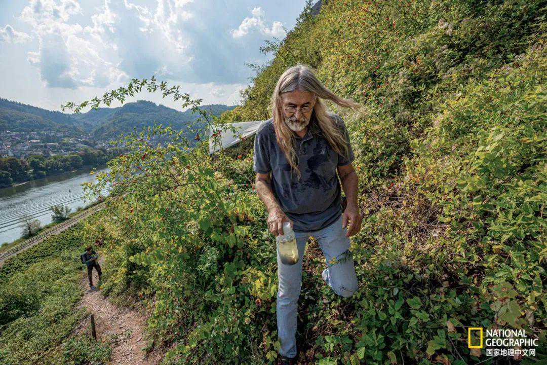 在德国摩泽尔河岸,克雷菲尔德昆虫学会的总负责人马丁·索尔格拿着一瓶用马氏网(一种用来捕捉飞虫的类似帐篷的精巧装置)捕捉到的标本。