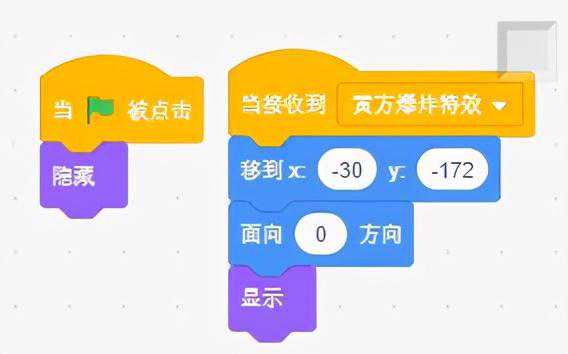 3)【爆炸特效】接收到消息的爆炸效果角色,移到蓝方坦克位置,并不断的切换下一个造型
