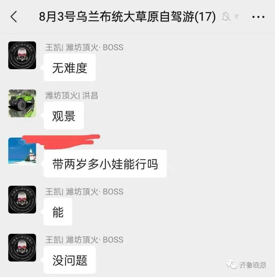 张女士提供的“8月3日乌兰布统大草原自驾游”群聊截图显示,潍坊顶火越野改装俱乐部的工作人员曾在群里表示,活动“无难度、观景”。有自驾车主询问:“带两岁多小娃能行吗?”工作人员回答“能,没问题”。