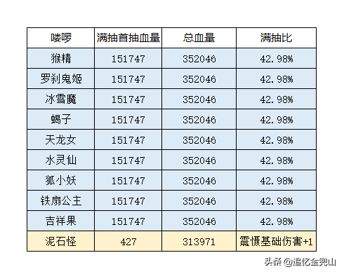 二转142等级,各修罗主怪、喽啰的满抽首抽血量、总血量及满抽比数据如下: