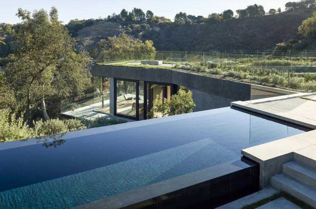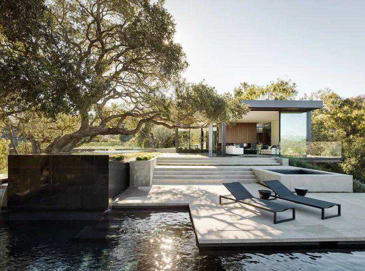 一个75英尺高的游泳池,四面中的三面有无限的边缘,将房子一分为二,滑入最大的橡树下。