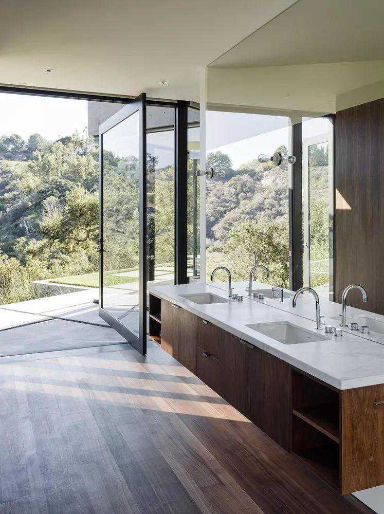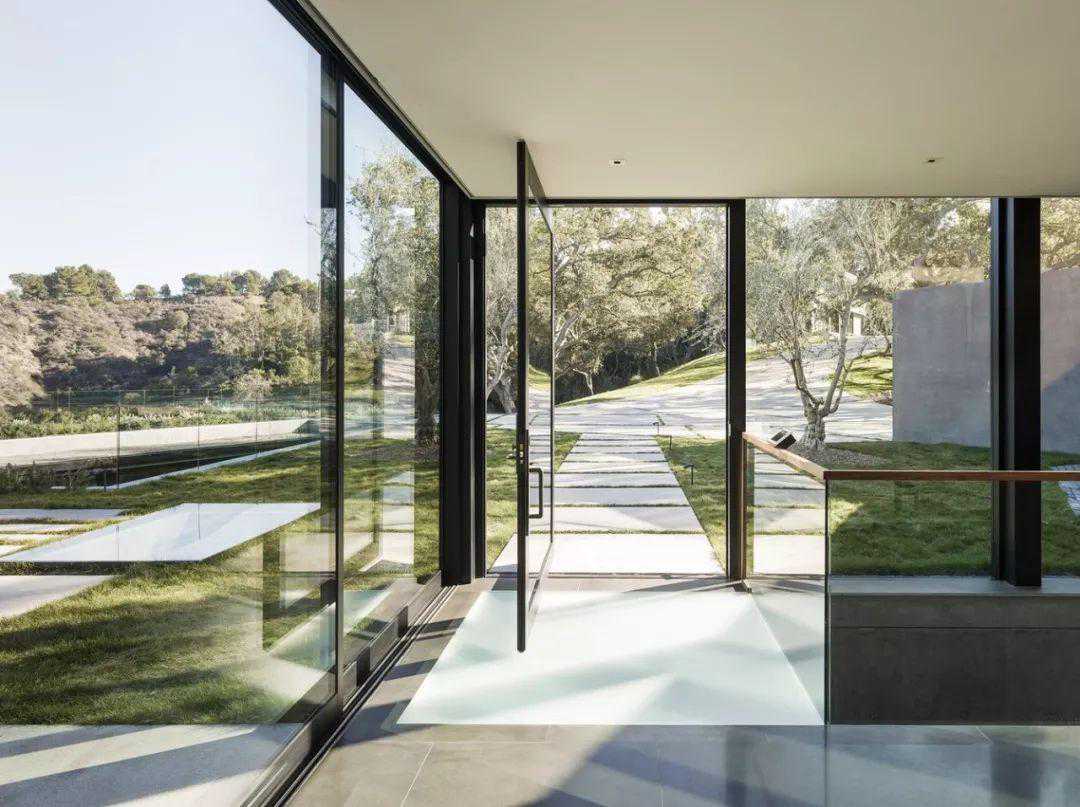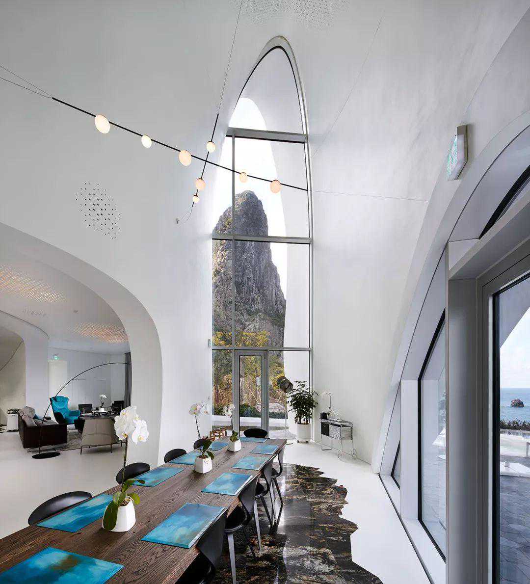 石头地板采用蓝灰色中性色调,俯冲和倾斜的墙壁和天花板采用白色,底层的公共空间稀疏地配有现代元素,让景观成为中心舞台。