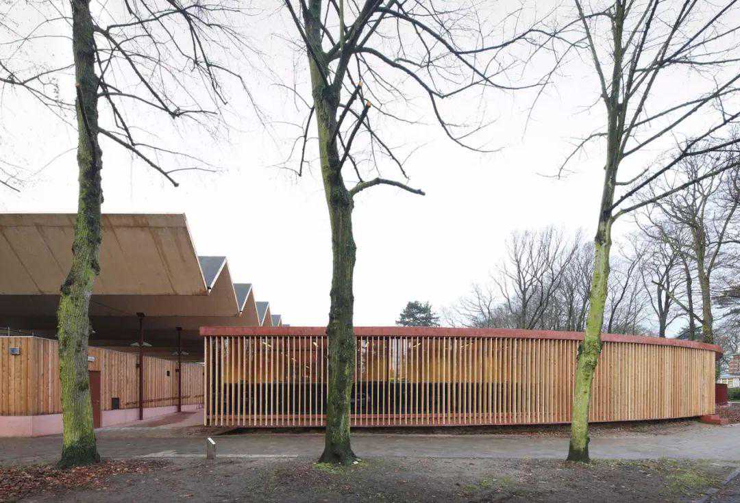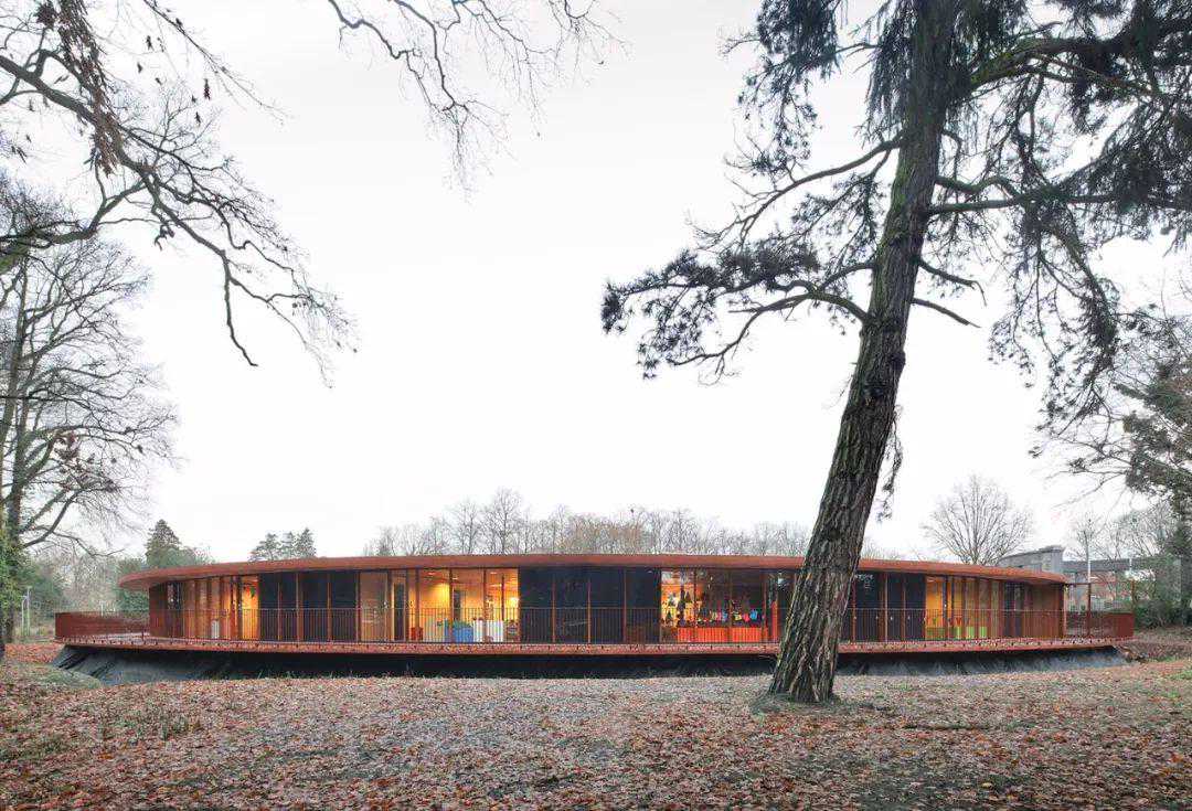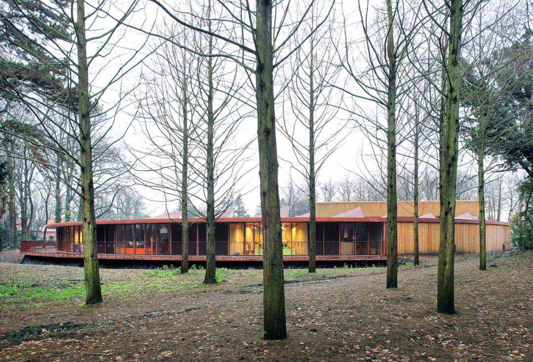 托儿所建在一个由高大树木环绕的公园中,设计师仔细考量过周围的环境之后,想到了一个可以因地制宜的办法。那就是将建筑设计成公园内的一个亭阁,仿佛是和公园连为一体,和周围环境相辅相成的存在。