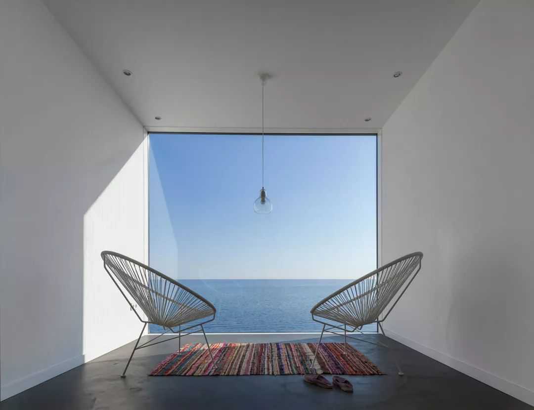 在室内,白色墙壁和天花板,以及深灰色熨平地板的极简主义美学,赋予室内一种中性的氛围,在这种氛围下,深蓝色的大海和变幻不定的天空,在它们的光辉中脱颖而出。