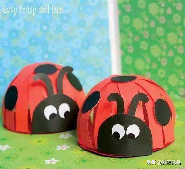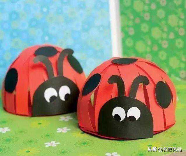 将球形卡纸的下部压平,粘上圆形卡纸,卡纸就化身萌萌的七星瓢虫啦~