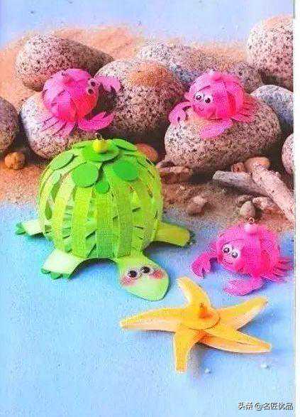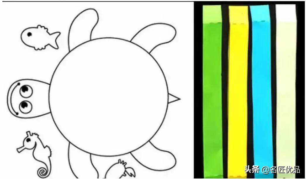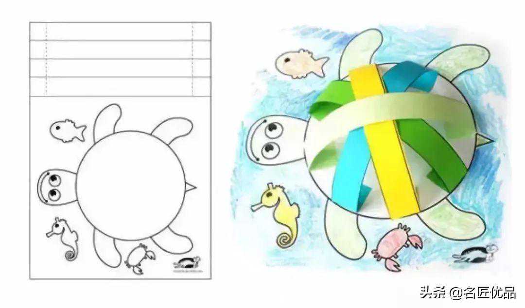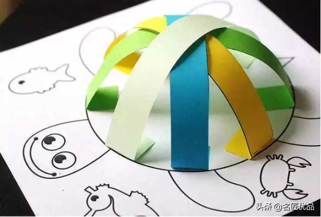 制作方法:先在纸上绘画出小乌龟和它的小伙伴们,再用彩纸剪成的纸条,粘贴在它的背上变成壳,一只立体的小乌龟就出现啦!小乌龟可以自己画,也可以打印上面的图纸后,再用蜡笔涂色。