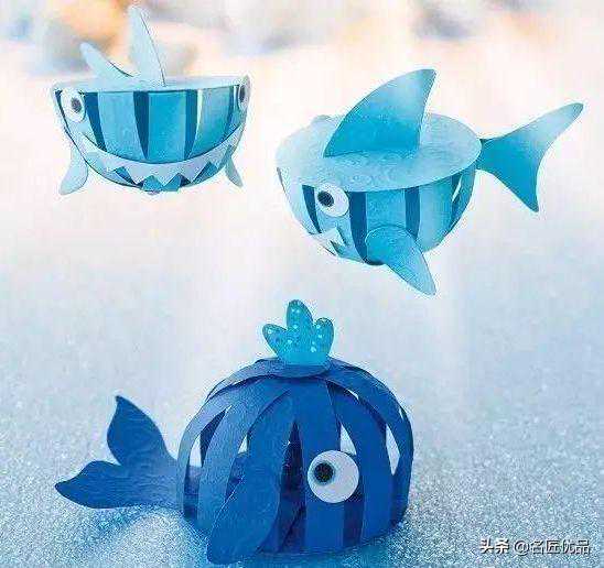 蓝色球形卡纸,粘上卡纸做的尾巴和鱼鳍,可爱的蓝鲸鱼送给小朋友们~