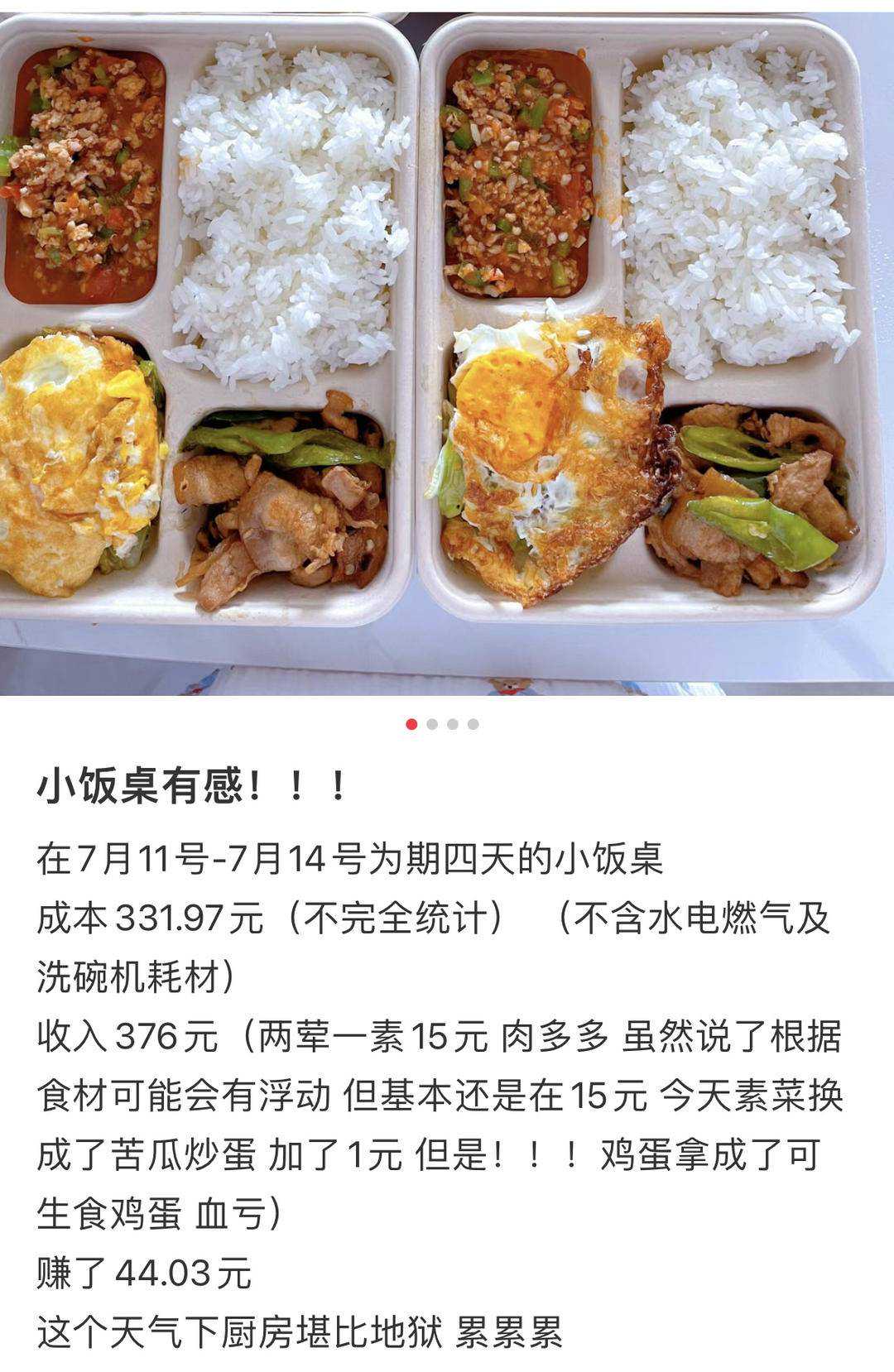 利润一天可能只有一杯奶茶钱,还要干买菜、洗菜、做菜、送餐等一系列辛苦活,有人做了几天就放弃了。“四天小饭桌成本331.97元(不含水电燃气等),售价两荤一素15元,收入376元,赚了44.03元。夏天下厨房堪比地狱,累累累。”四川一位经营者分享道。“不能说完全不挣钱,但每天下班到家炒菜焖饭打包,从晚上八点多忙到凌晨2点,还要从超市手提肩扛十斤食材爬六楼回家,付出与回报太不成正比。”坚持了三个星期“成人小饭桌后”后,一位北京网友发布歇业通知说道。
