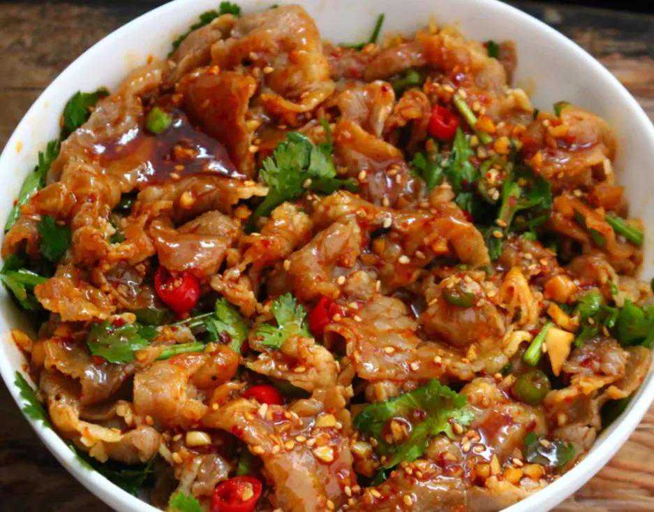 (2)调味汁:碗中加入适量的蒜末、白芝麻、小米辣、辣椒粉、生抽、陈醋、白砂糖、食盐、鸡精、香菜充分搅拌均匀备用。