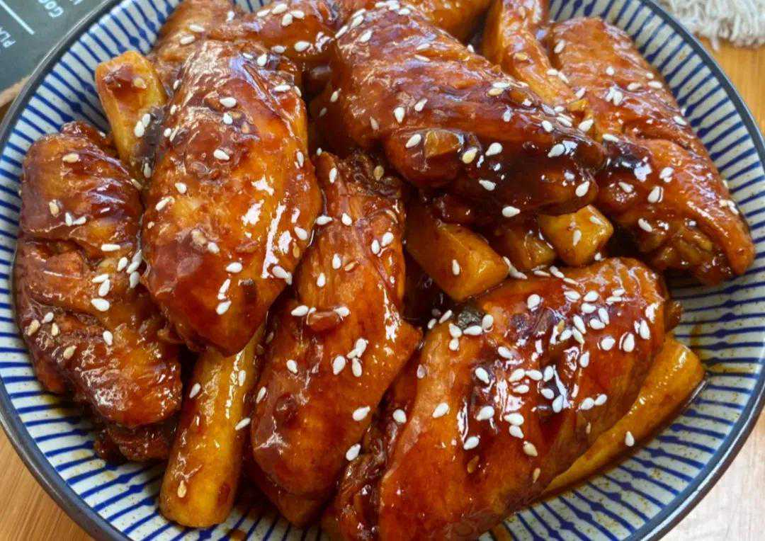 (6)下入年糕,盖上锅盖大火炖开,转小火炖至汤汁浓稠,鸡翅软烂脱骨。