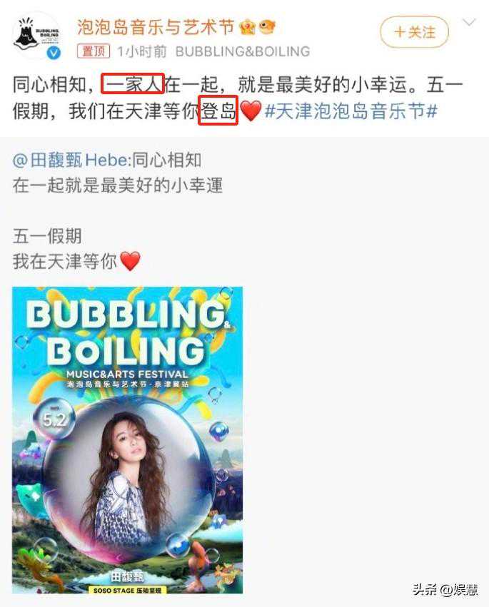 田馥甄的文案明显是提前沟通过的,就在田馥甄微博动态发布2分钟后,泡泡岛音乐与艺术节官方账号也用这样的文案发布了一条动态。