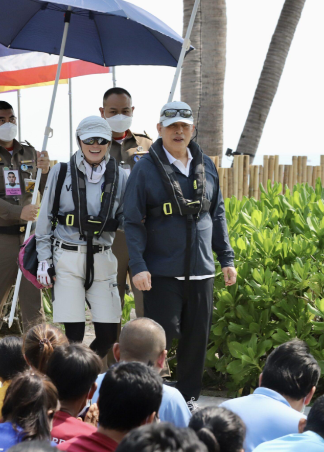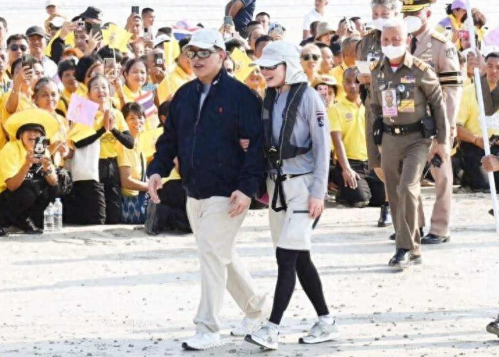 苏提达搀扶着泰王走在沙滩上看起来恩爱十足。