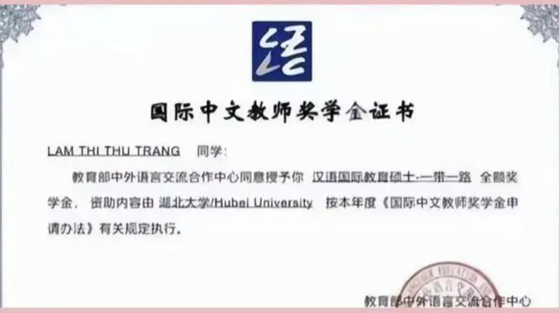 而且还凭借自己留学生的身份,她还拿到了湖北大学的全额奖学金。