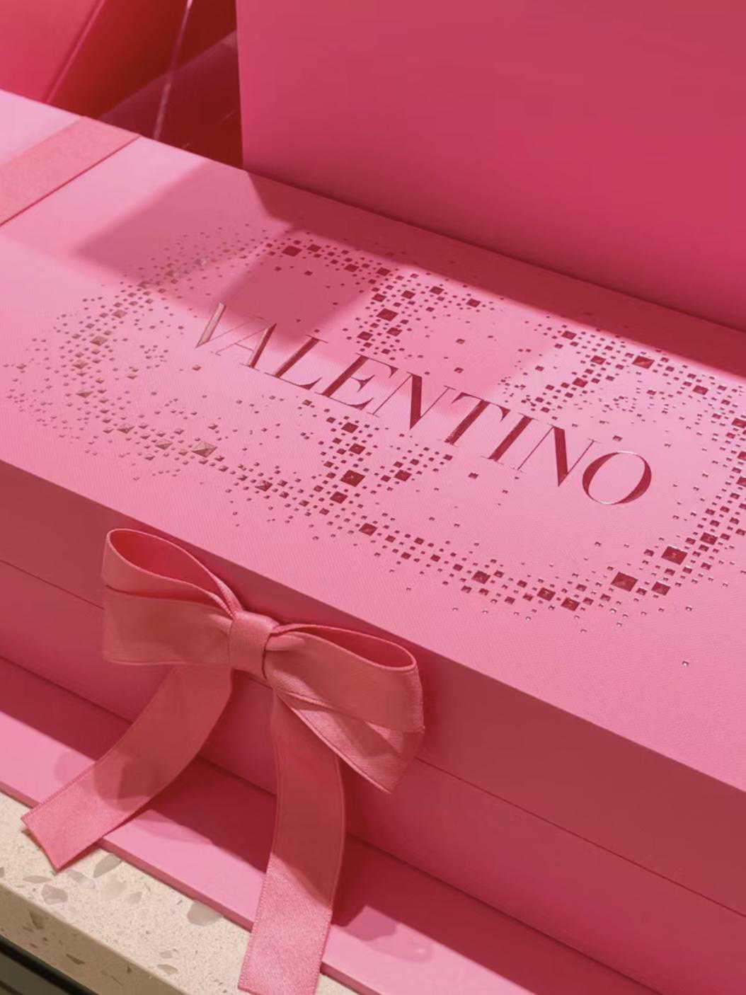 礼盒以裸调华伦天奴粉包装,粉钻铆钉化为品牌标志Vlogo,星光点点;搭配秀场经典粉色蝴蝶结悬坠礼盒边缘,兼具少女风与女王风;特殊盒中盒设计让每天充满惊喜。