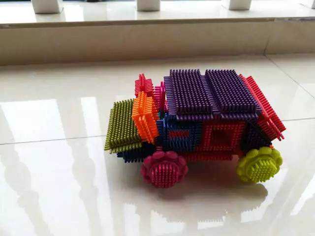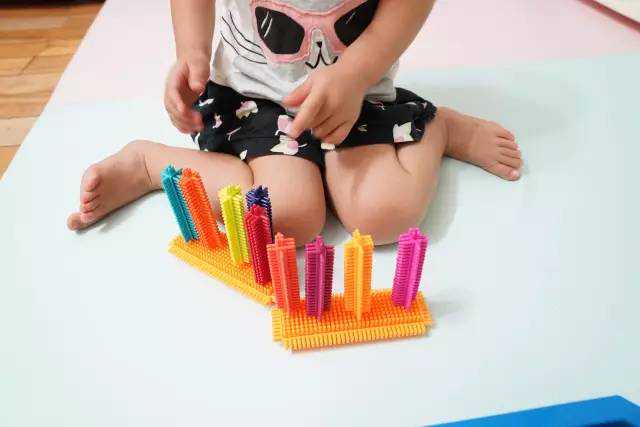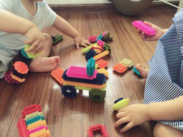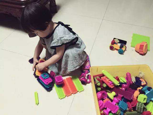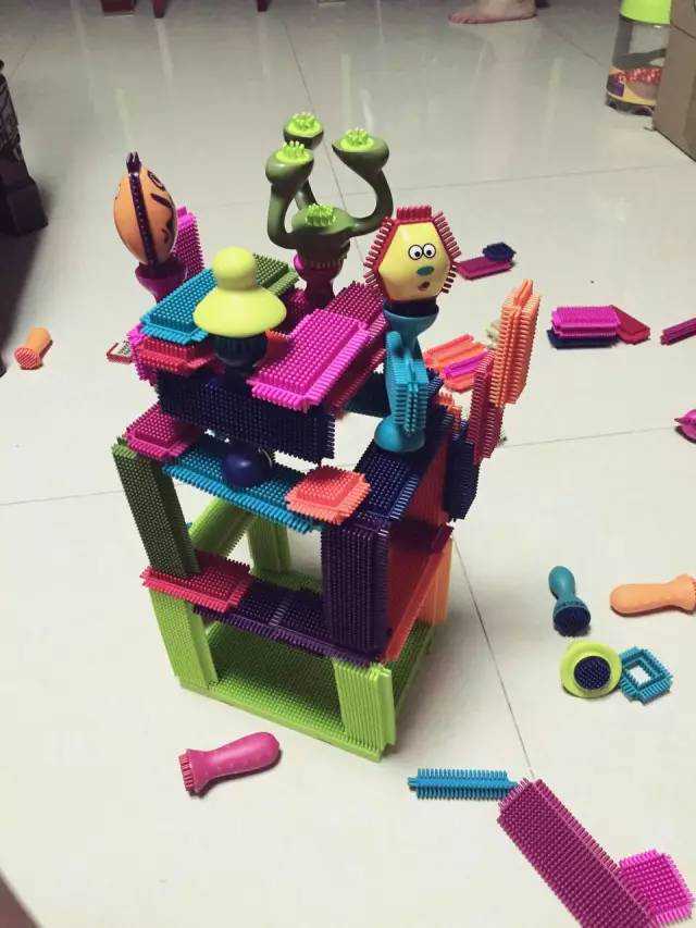 因为接触面比较大,只需要孩子稍微用力,很容易就拼上了。当孩子精细运动尚未发育成熟时,“垒高高”通常是他们最早学会的搭建玩具的玩法。鬃毛积木容易上手,很容易带来乐其和成就感,于是就爱上拼搭积木啦。所以对于较低龄的孩子,我更倾向于给她玩鬃毛积木。