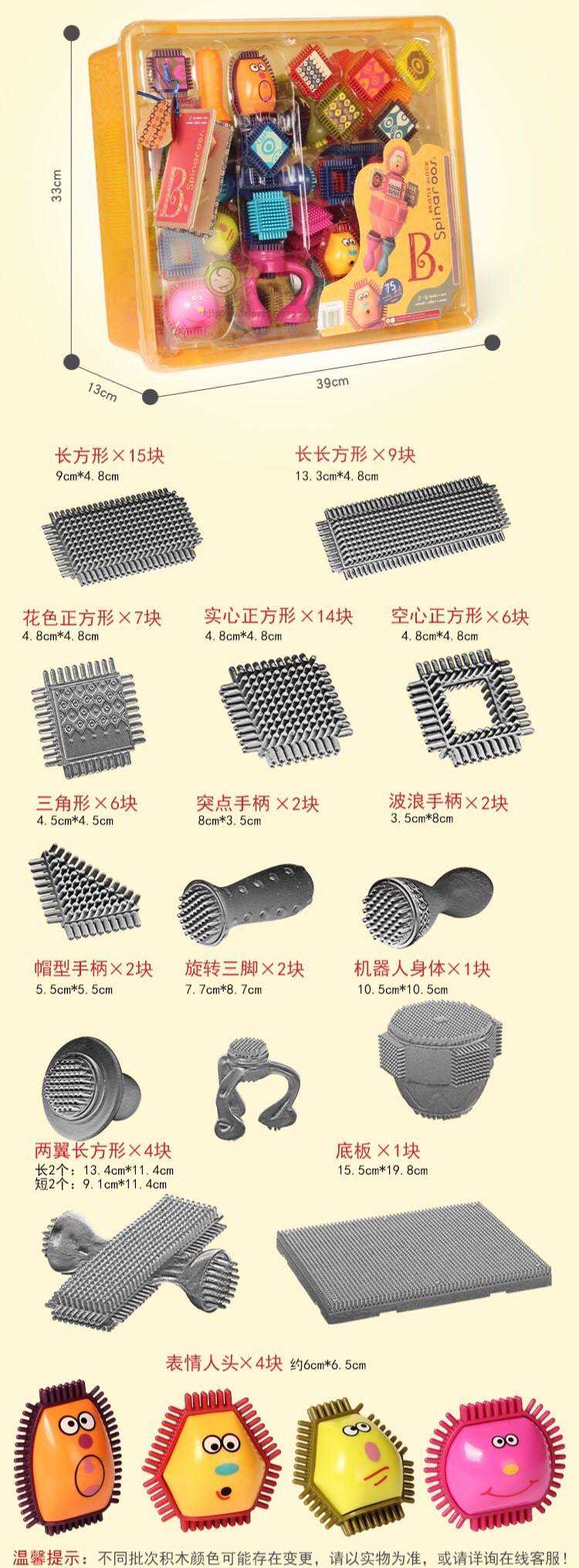 箱装75粒的配有一块鬃毛板,几个有趣的怪脸和大块旋转积木,激起孩子玩耍的兴趣,拼出各种各样的物品,丰富想象力。