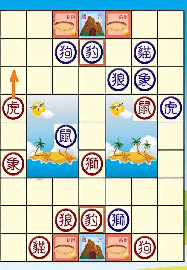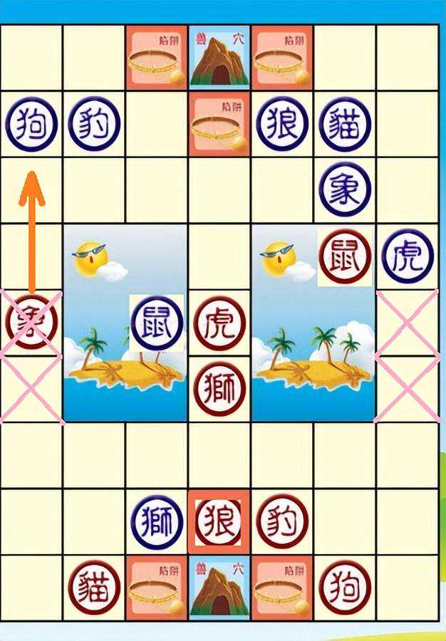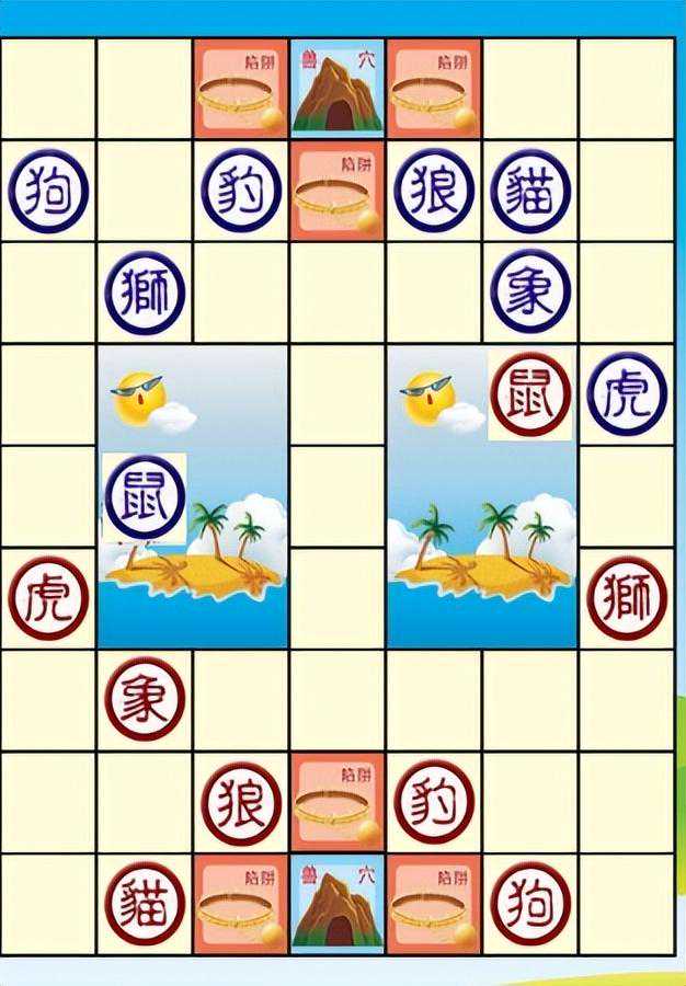 ③如果对方的兽类走进陷阱,己方任何一只兽都可以把它吃掉。如果敌兽进入陷阱,一回合后,自己的兽类不吃掉陷阱中的敌兽,当对方进入己方兽穴时,则本方输。