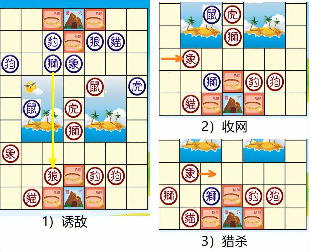 先露出防守空当诱骗对方狮子跳河攻入我方吃子,然后再用大象狮子合力围猎它。方案实施分三步:第一步诱敌,大象左移让出空当,使对方觉得有机可乘用狮子跳河攻入我方。第二步收网,对方狮子深入我方吃狼,大象返身关门困住狮子。第三步猎杀,在我方狮子加入配合封死狮子出路后,大象进攻狮子。狮子无路可逃只能被吃。