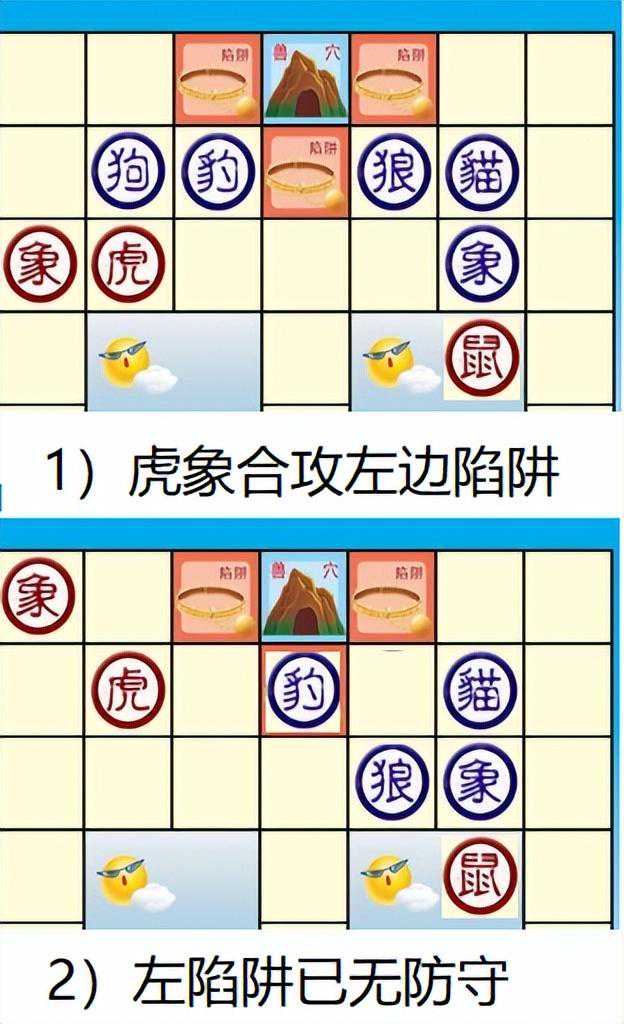两个棋子围攻中间的陷阱,只需一个大子带一个小子就可获胜。因为紧邻中间陷阱旁边有三个格子。如果我方棋子占了其中两格那么对方棋子只占一格。我方先用小子进陷阱,被对方棋子进去吃掉,我方大子再进陷阱把它吃掉。此时陷阱旁已无棋子防守。下一步我方大子进入兽穴,我方获胜。