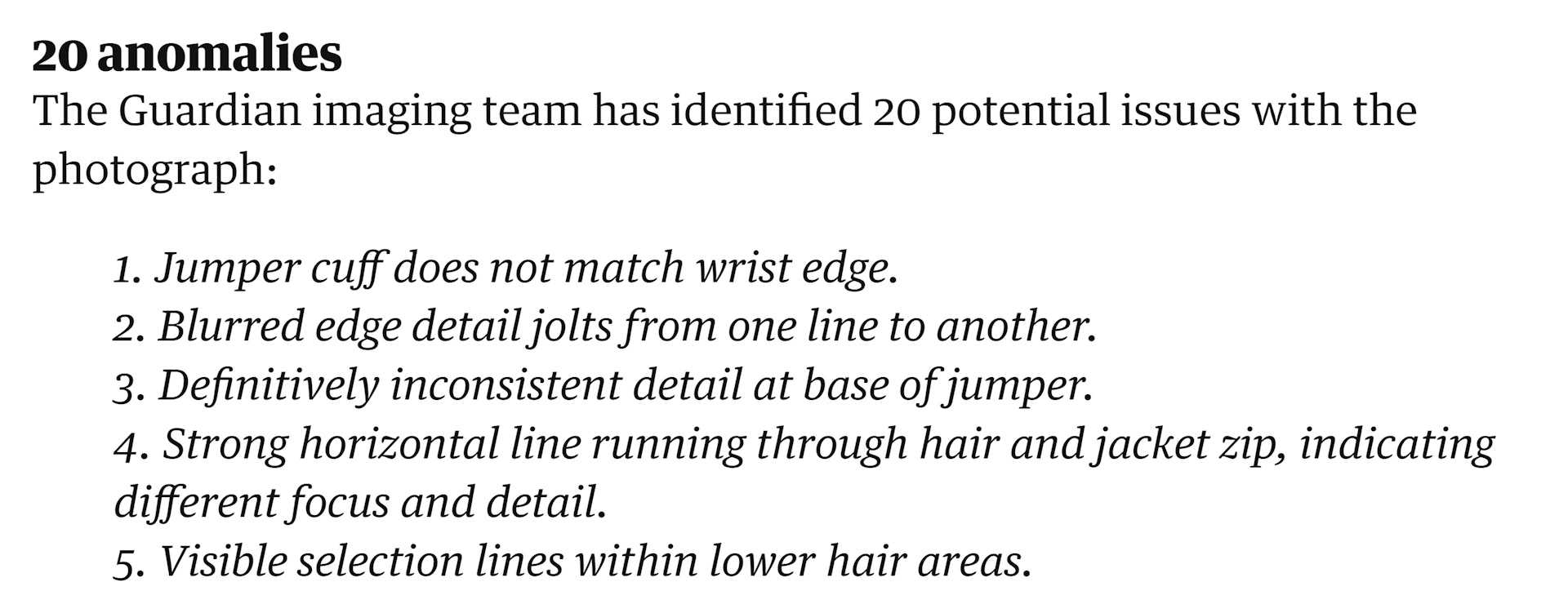 想不到,天生固执的英国人报纸《卫报》的图像团队分析(负责找名人茬),该张照片或有多达20处细节经修改。