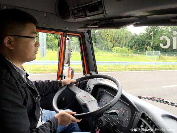 该车的AMT换挡杆的设计跟此前东风天龙、联合以及欧曼H5上的类似,换挡杆后面有一个旋钮,往左转是D档前进档,中间位置是空档,往右旋转是R倒挡,不过卡玛斯这台车上旋钮档位开关并没有任何标注。打着车,选择前进档,往左扳了下转向灯开关,手感也是比较重。系统默认的是二档起步,往左打方向,第一把居然没有抓动方向,莫非这台车方向没有助力转向?询问了下副驾驶的采埃孚工作人员,得到了肯定的答复,这才明白难怪这台车方向盘做那么大呢!