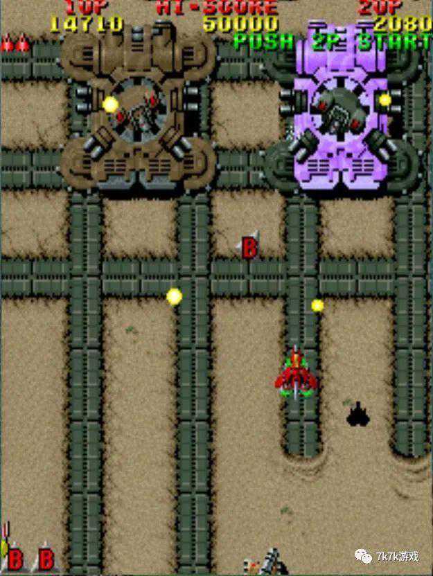 雷电的初代非常经典,玩家能使用的子弹颜色只有两种,要么激光要么散弹。另外辅机也有两种,一种是导弹,一种是跟踪弹。