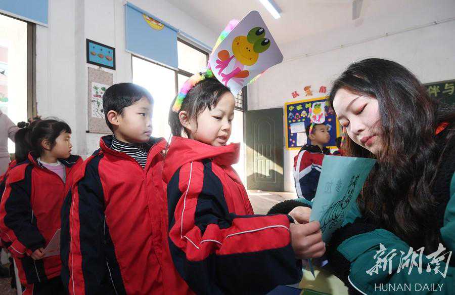 12月27日,长沙市开福区马栏山小学,一年级学生在参加“树洞说话”看图说话游戏。