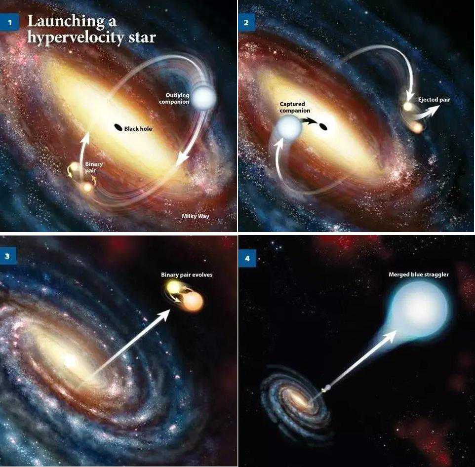 这个模型就是双星系统被黑洞捕获时,一般的情况就是双星中一颗被黑洞捕获,而另一颗则会因为获得了黑洞引力加速效应而被甩飞,在很多情况下这个速度能达到星系逃逸的速度!