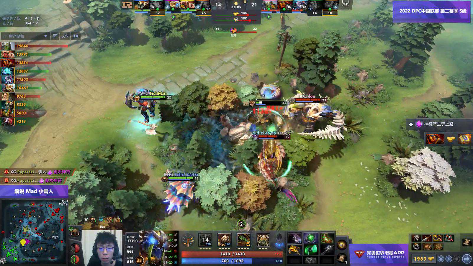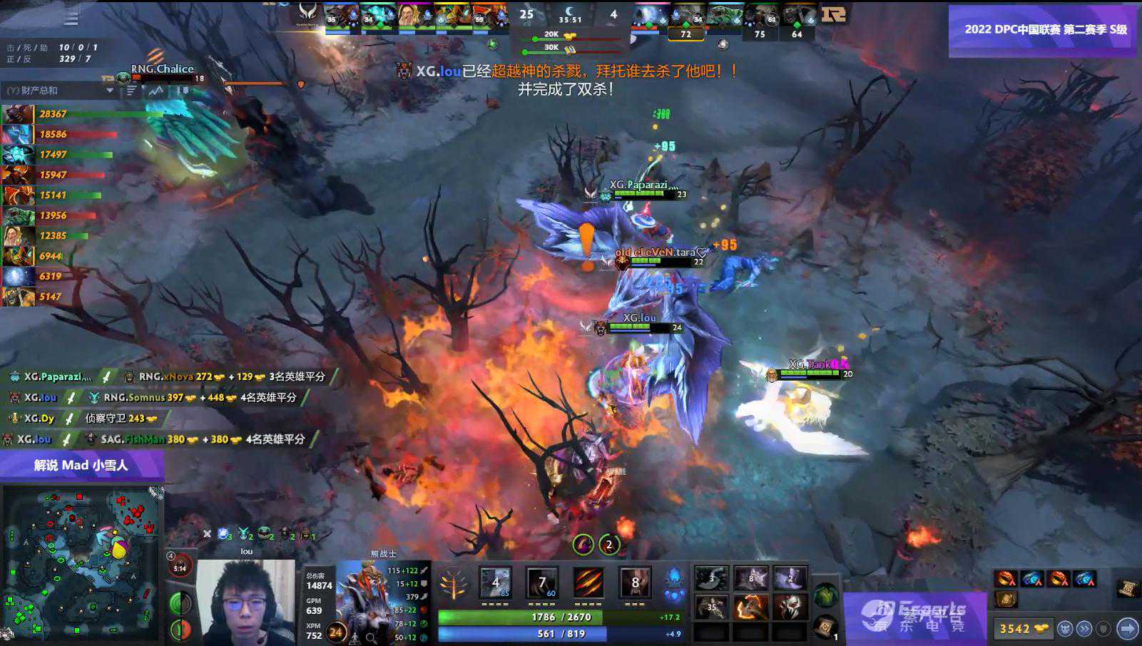 比赛进入中期,在劣势已然特别大的情况下RNG灵机一动,依靠着Chalice支配头盔所召唤的鹰身女妖不断的吸引着XG的注意力并趁机帮助队友们在劣势极大的情况下控下二代肉山稳住局面。而在大意丢盾后XG也是被迫停下了自己进攻的脚步并转入防守带线状态,依靠着较好的配合与读信息能力XG也是顺利的拖掉了RNG的肉山盾,在盾消之后双方也是一直僵持了下去,直到33分钟时双方才围绕着三代肉山打了一波正面的10人团(XG赚人头和A杖碎片,此战过后嫖到A杖的熊战士经济达到2W8,甩第二名的拉席克1W经济)。