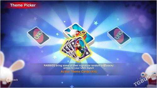 在《UNO》中,玩家可以通过在线下载的主题包自定义每一轮的游戏玩法,例如与游戏发售同步推出的“疯狂兔子”主题包将带来崭新的游戏体验包括强力的行动卡以及特别的游戏音乐。这些可下载的主题包将让玩家的UNO之夜活跃起来,从玩家的头像框到主题背景都焕然一新。随后,育碧旗下两款游戏系列《舞力全开》以及《雷曼》主题也将加入到游戏中,每款售价为1.99美元。