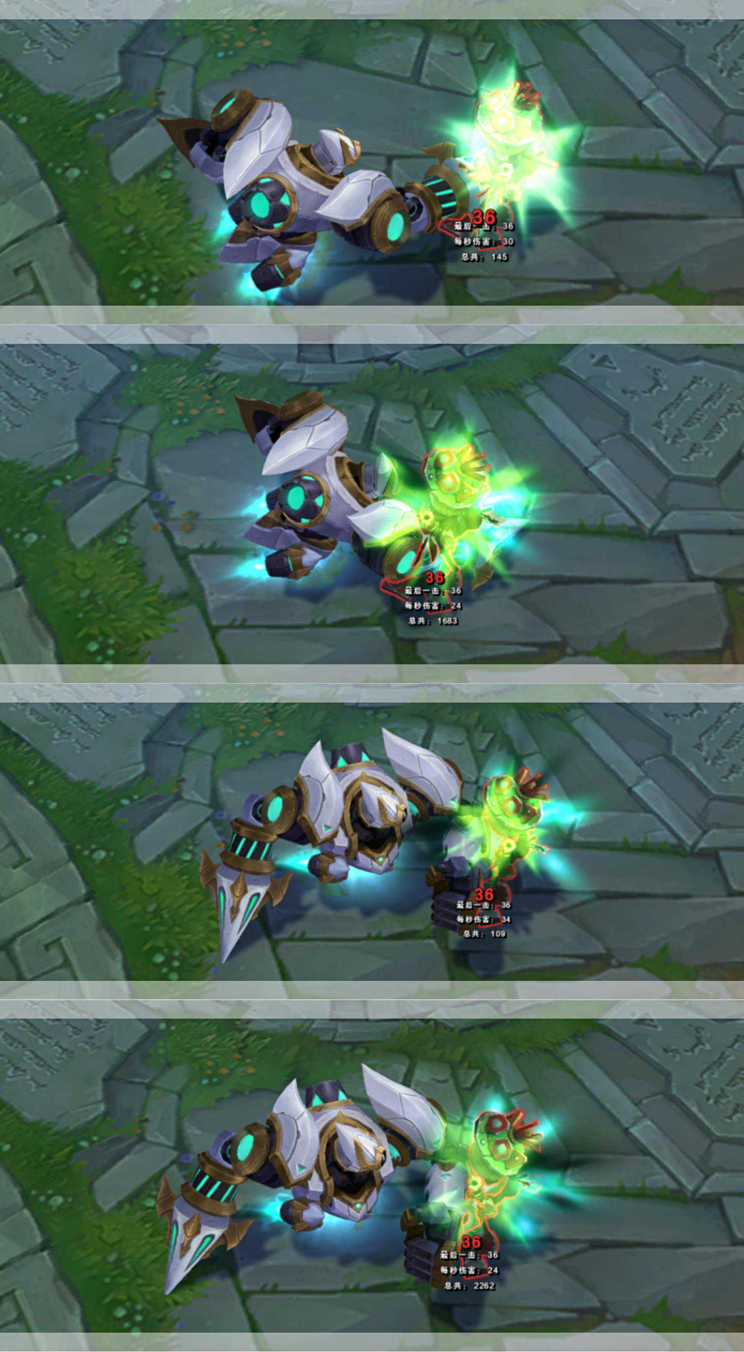 【R被动】:升级R技能后,身体就会被一层青绿色电光护体保护。而且身上的一些纹路或者说身上的缝隙(水口)更合适,这时也会点亮为青绿色。表现出能量过载的现象,这两种颜色的搭配非常简约且高级