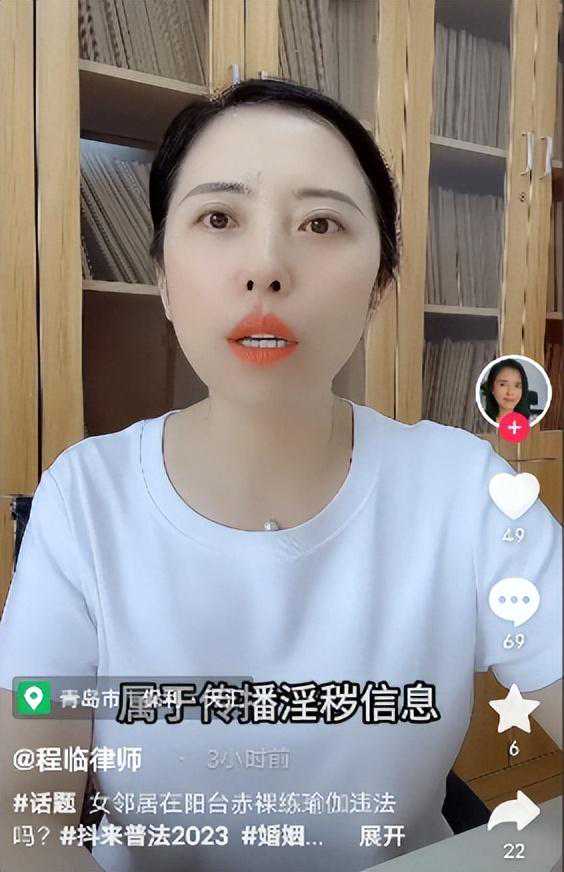 根据一位律师的解释,有一位女性经常在阳台上赤身裸体练习瑜伽,然后被邻居看到,引发了争议。邻居的妻子感到愤怒,要求这位女性收敛行为,但是女性坚持认为,在自己的家里,她有权做任何她想做的事情,认为问题在于邻居未能妥善管理自己的丈夫。