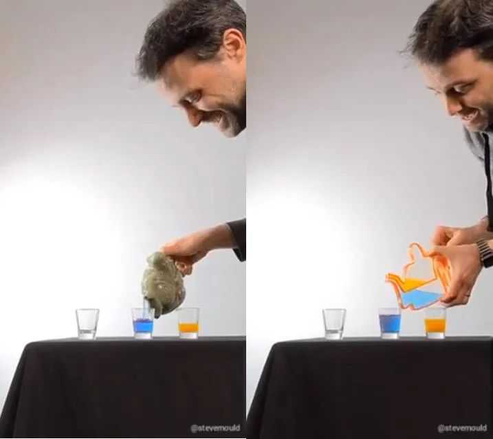 为了防止观众听不明白,SteveMould还制作了上下排布的2D透明版本,更直观地展示了大气压在其中的作用。