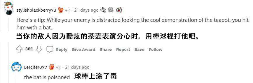 还有人不知是不是看惯了“杀光所有人就没人知道我来过”的莽夫型刺客,吐槽这个壶只是个花里胡哨的小玩具。但同时又觉得它作为吸引目标注意力的小把戏倒是不错,趁对方因茶壶的神奇表演分心时,直接一球棒砸过去更加简单粗暴。