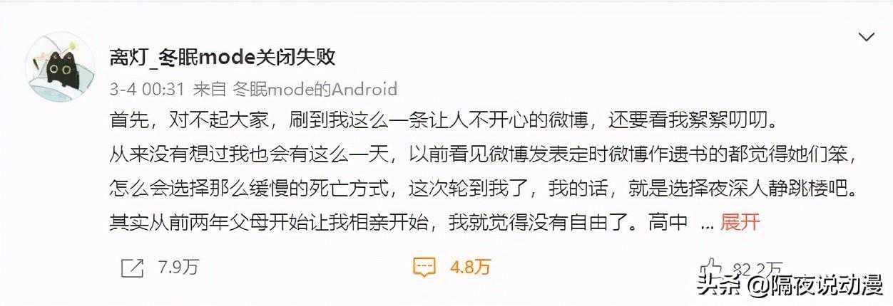 这不就在3月上旬,又一位ACG喜好者悄然地结束了自己的生命,而此事也在过去两天成为了甚嚣尘上的话题---