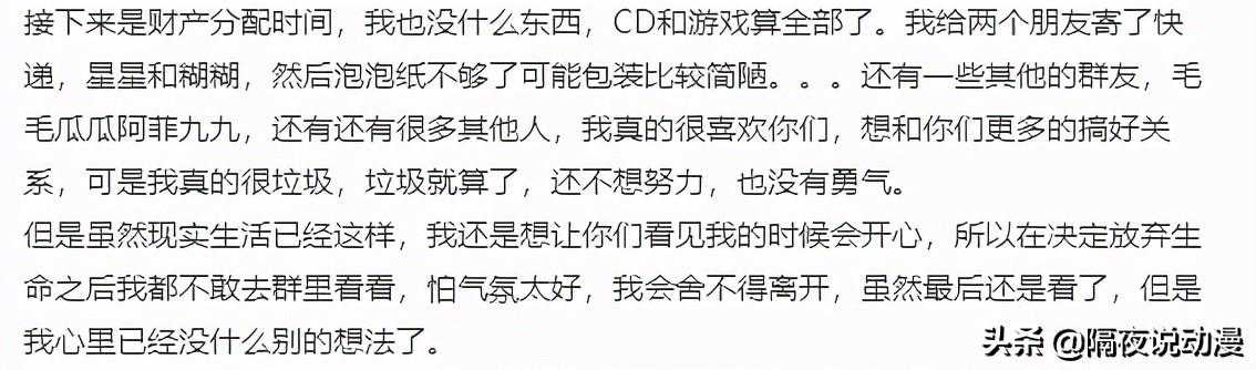 不仅如此,她也在遗书中坦白了沉浸游戏世界的自己其实就是对现实生活的逃避,但奈何自己喜欢,而ACG也成为了她人生的唯一意义。