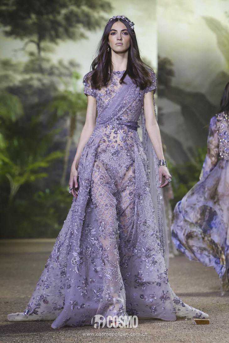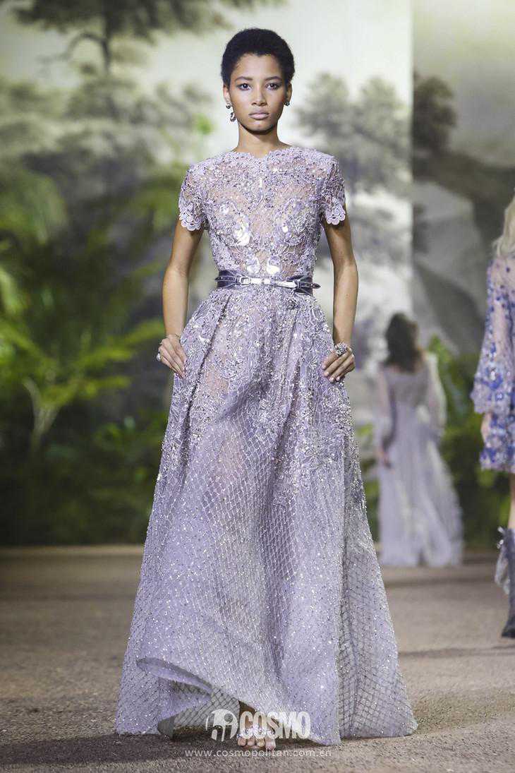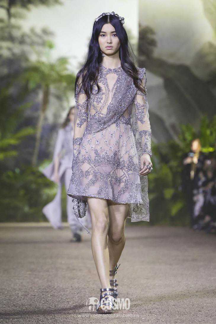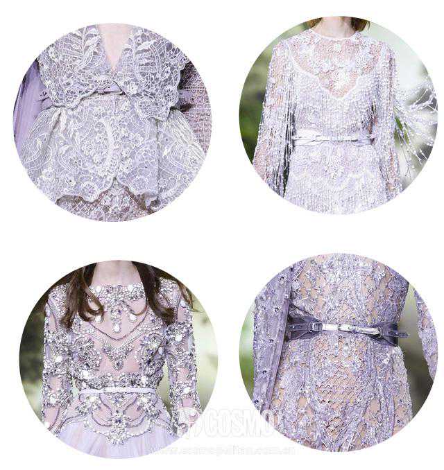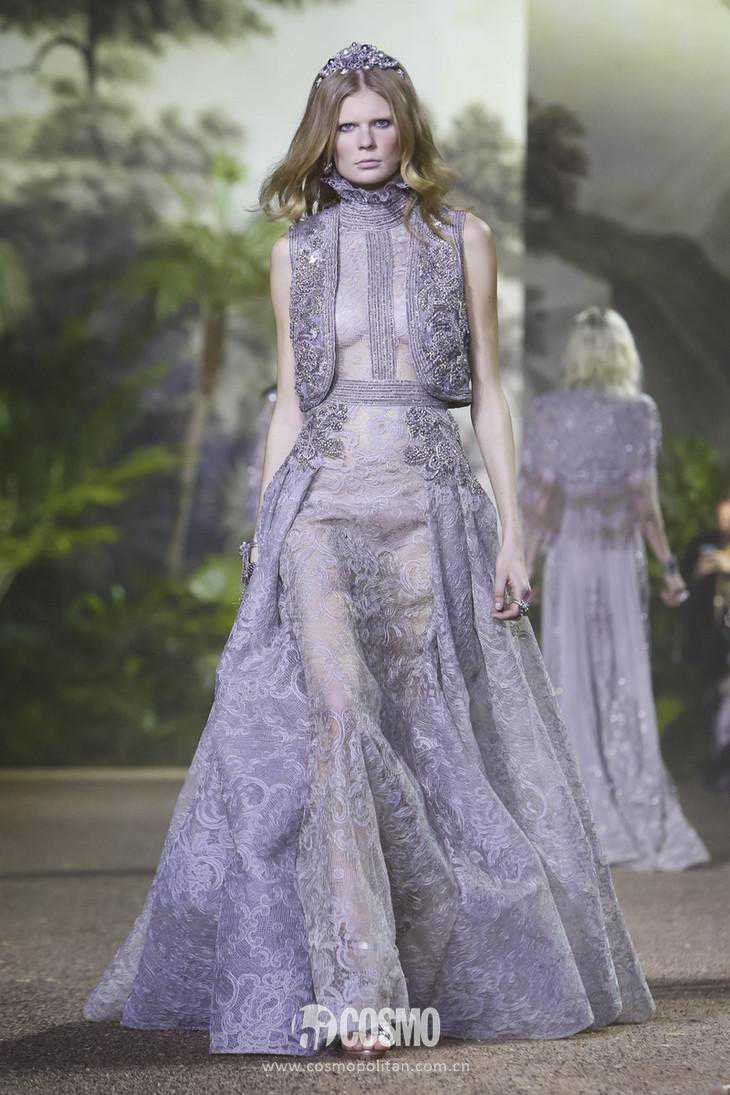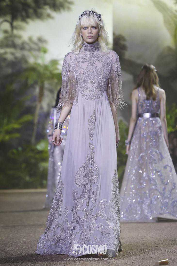 以华丽风格取胜的ElieSaab,将蕾丝闪缎、珠光面料、带有独特花纹的雪纺、银丝流苏、精细刺绣运用到极致,本季与印度风格营造出华美的淡紫色仙境。