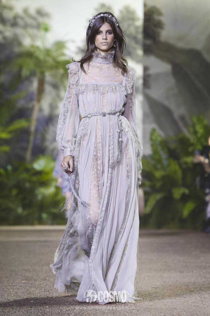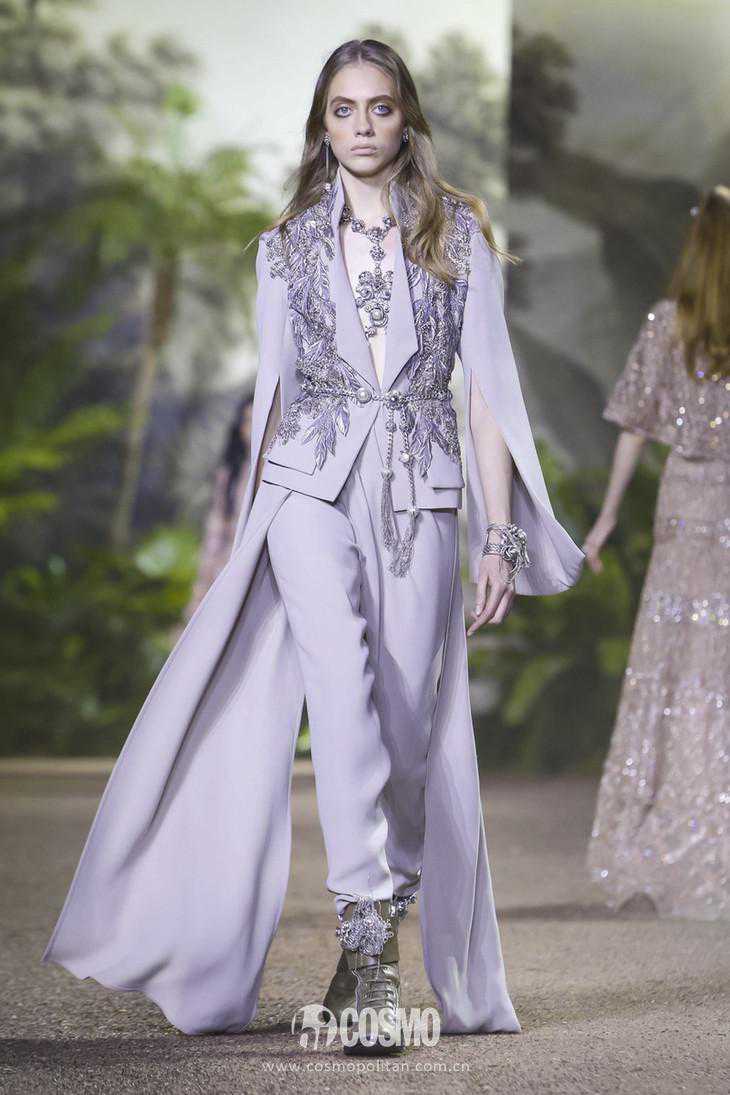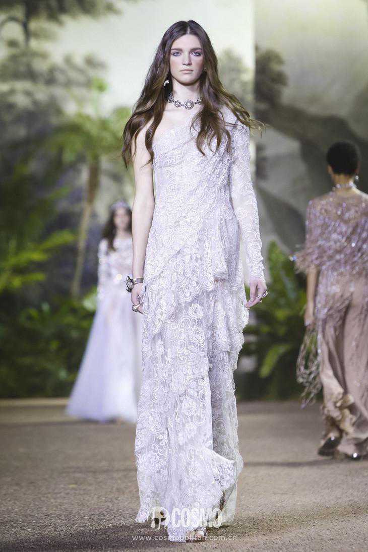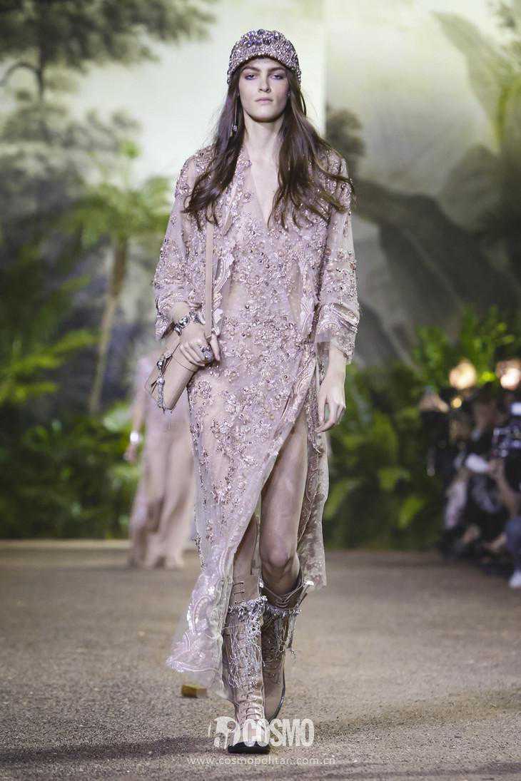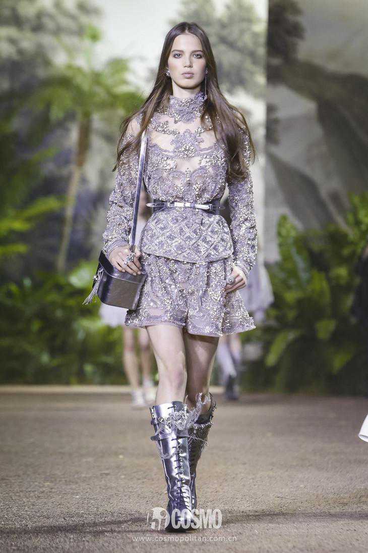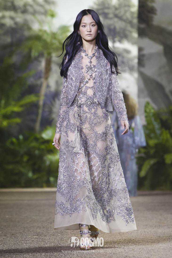 以华丽风格取胜的ElieSaab,将蕾丝闪缎、珠光面料、带有独特花纹的雪纺、银丝流苏、精细刺绣运用到极致,本季与印度风格营造出华美的淡紫色仙境。