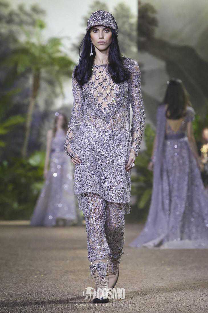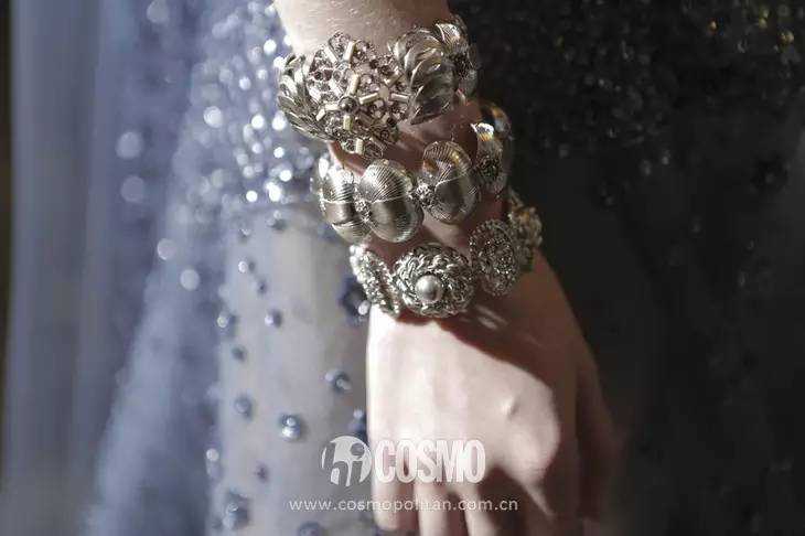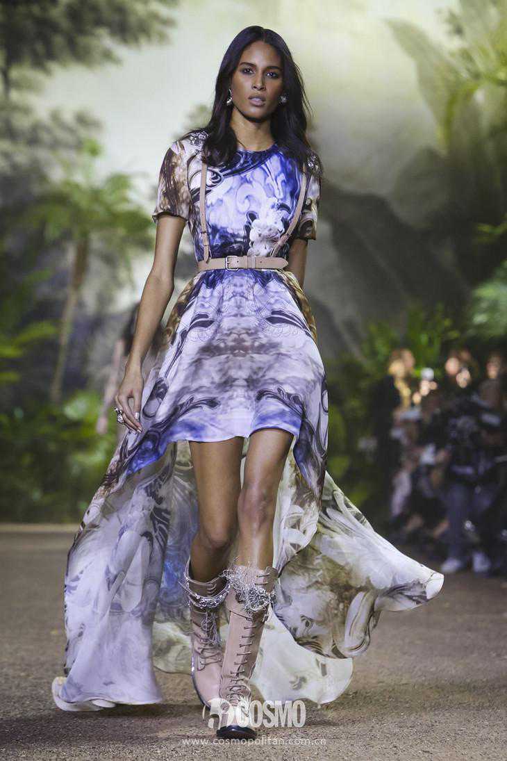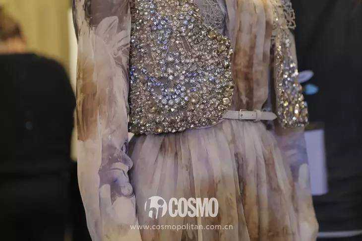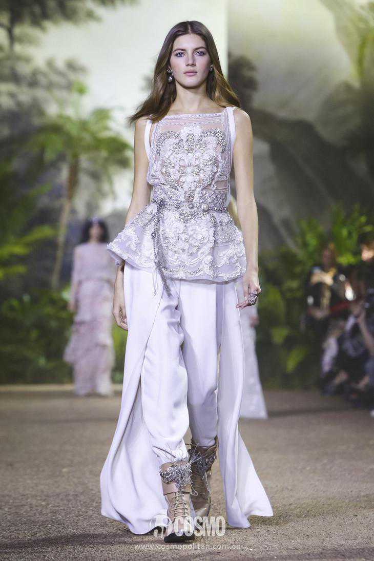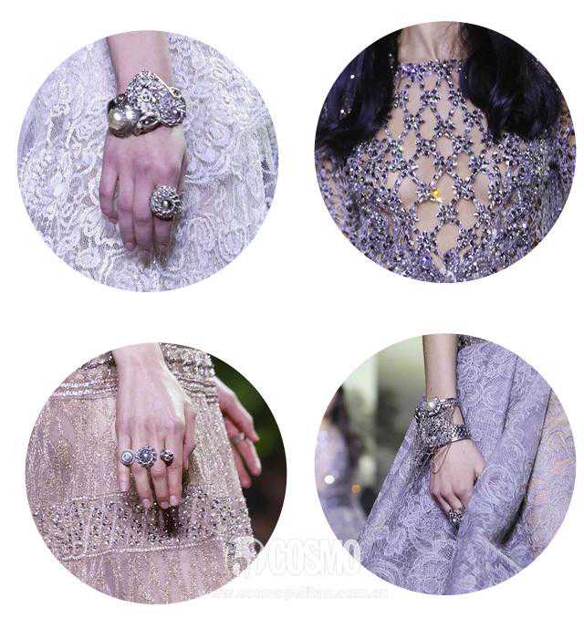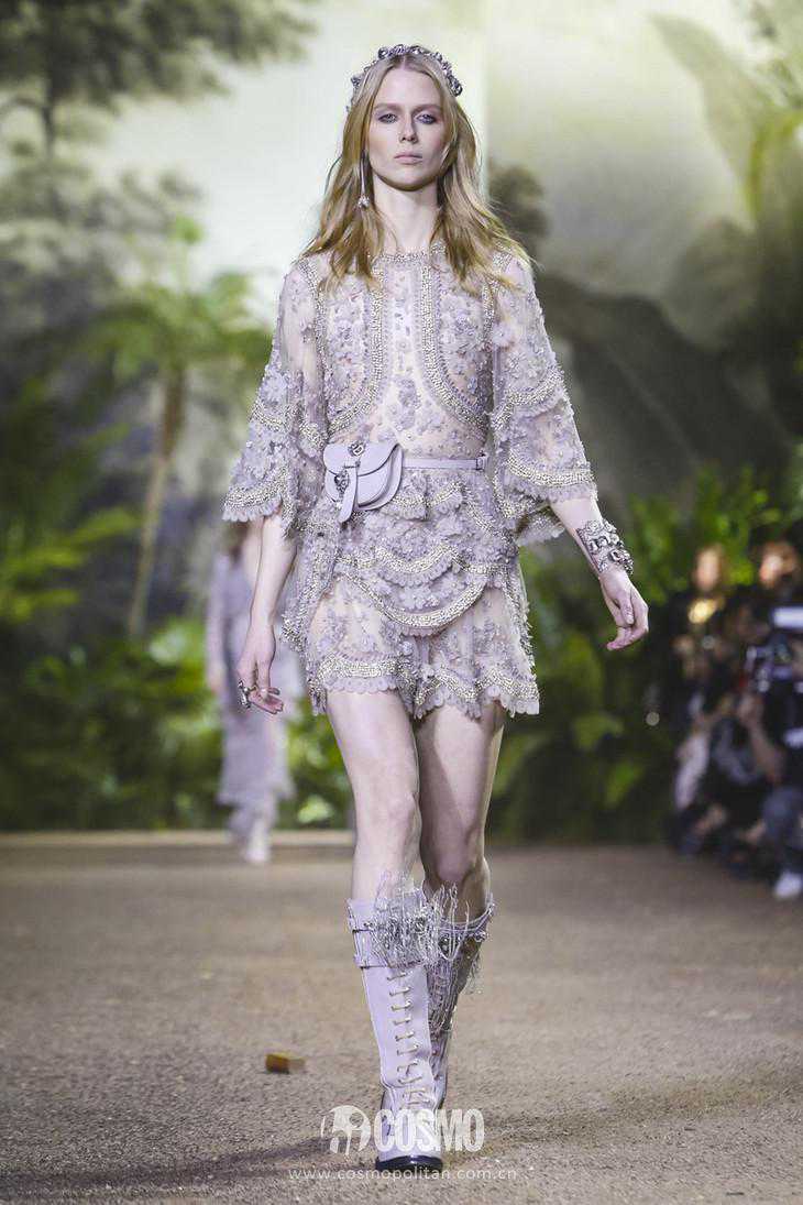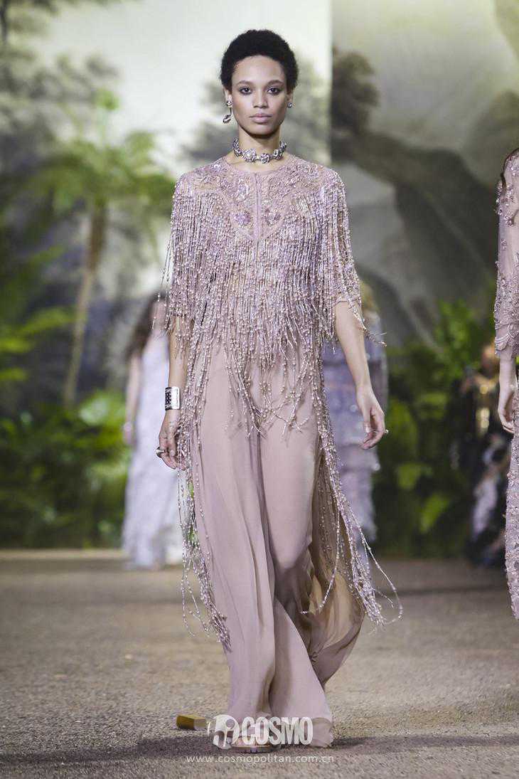 以华丽风格取胜的ElieSaab,将蕾丝闪缎、珠光面料、带有独特花纹的雪纺、银丝流苏、精细刺绣运用到极致,本季与印度风格营造出华美的淡紫色仙境。