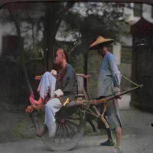 车夫推着独轮车,戴着草帽,皮肤黝黑,衣衫全是灰尘,脸上笑意显得特别淳朴。