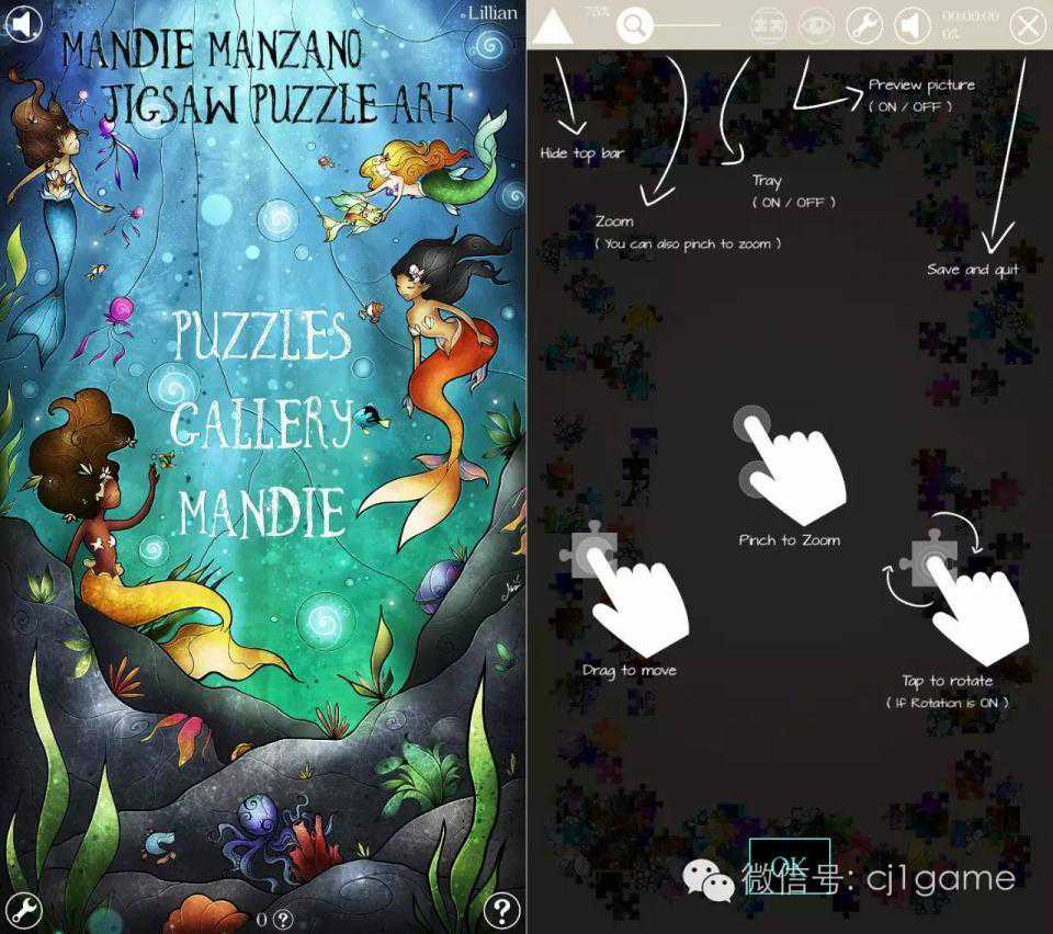 ▲拼图游戏《MandieManzanoJigsawPuzzleArt》的主界面与基本操作介绍