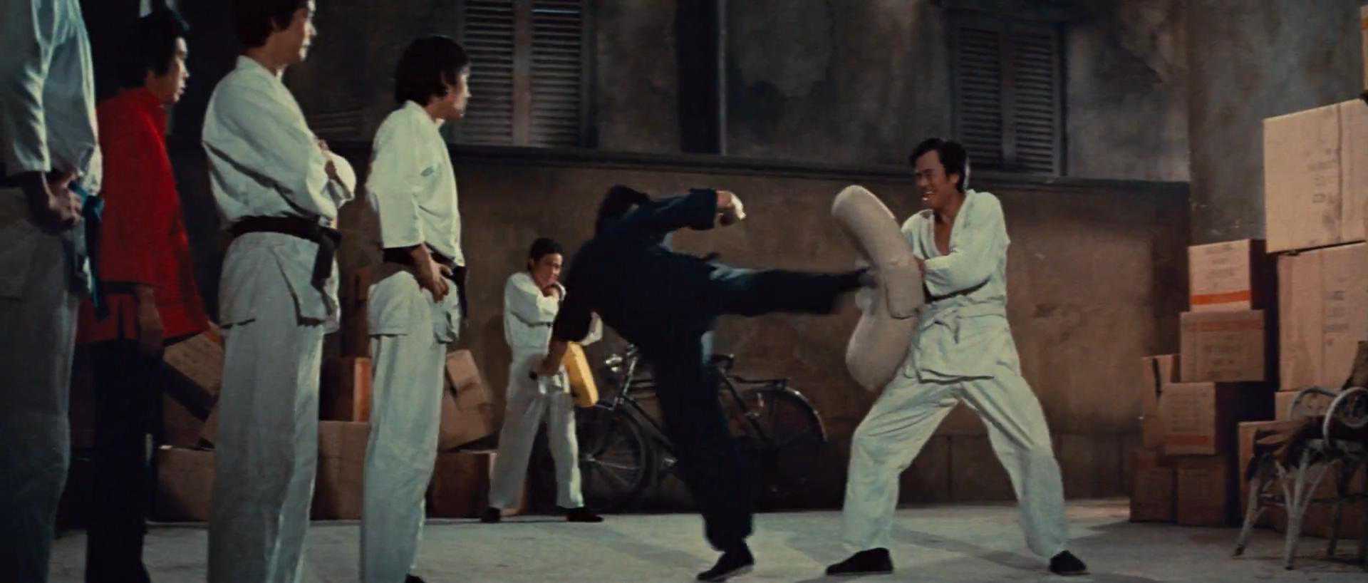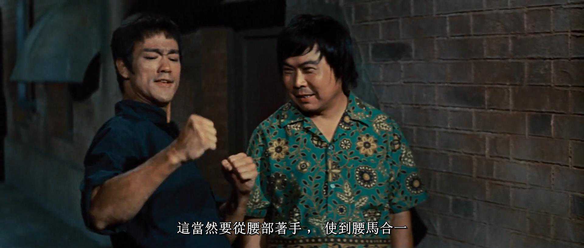 这一场景展示了两种腿法,尤其是侧踢。俯冲惯性势+稍向上踢=最强侧踢,这里的稍向上踢非常难,而且训练的难度系数也非常大。但是用“最难帧法”训练,便可以循习渐进,李小龙已经给我们展示了: