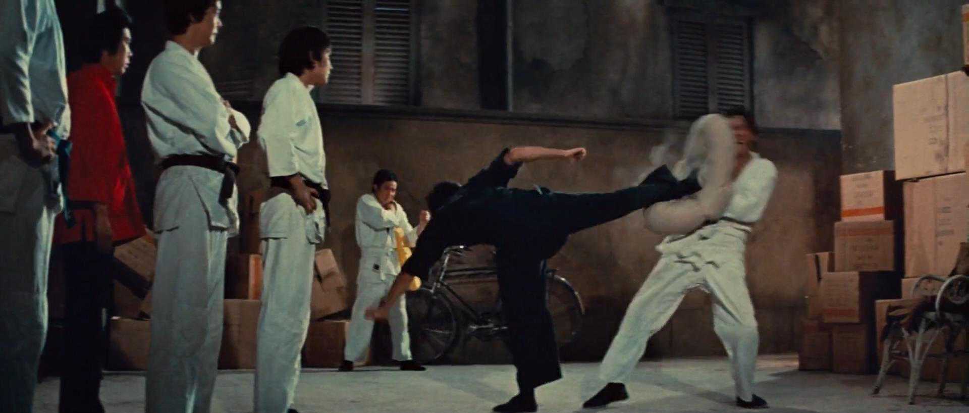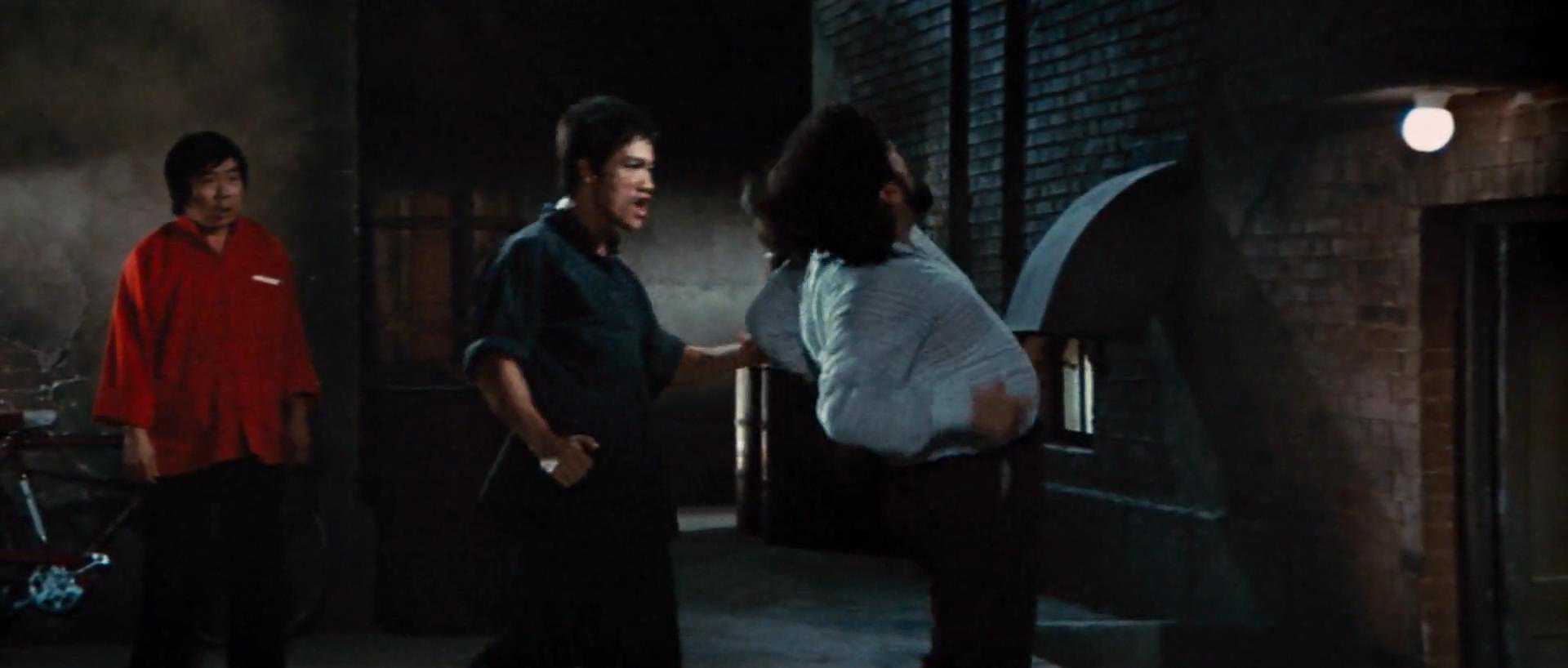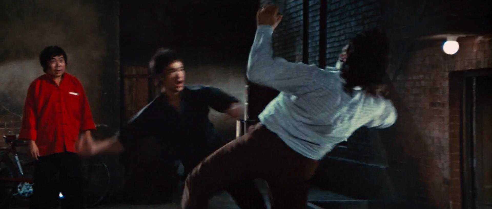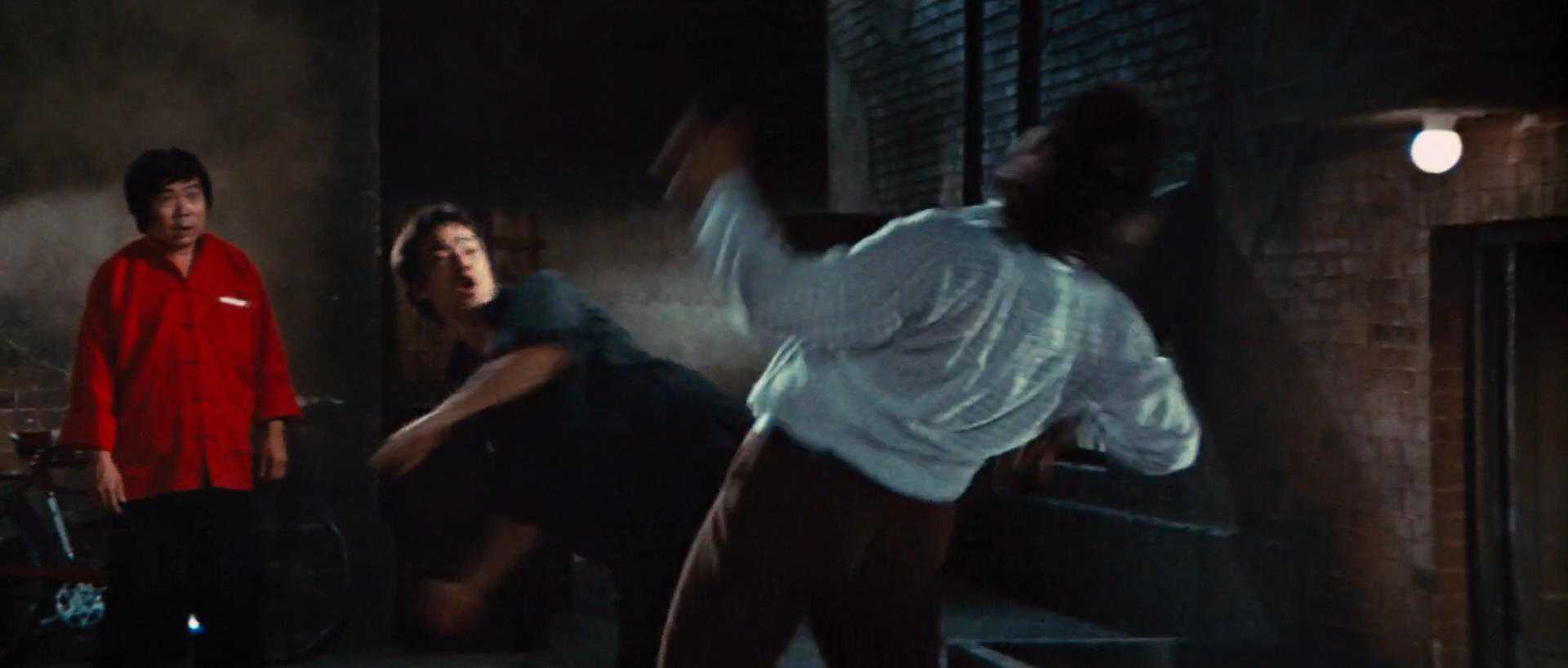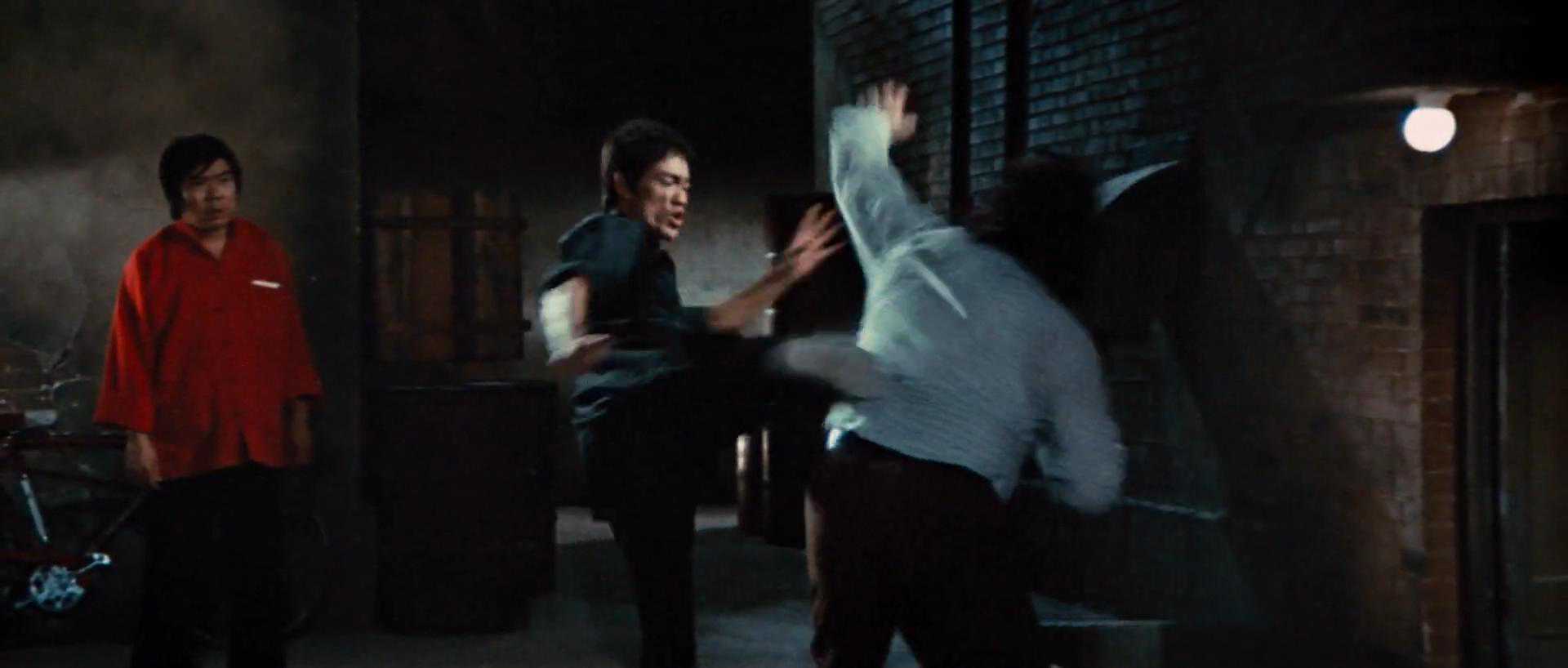 面对只会王八拳的搏击白痴,踢击是最有效的打击手段(一是攻击距离更长;二是维持下盘稳定就让普通人速率很低了,面对李的高速回旋踢无从反应)。一记回旋踢,高踢扫脸,结束与路人甲的搏斗。