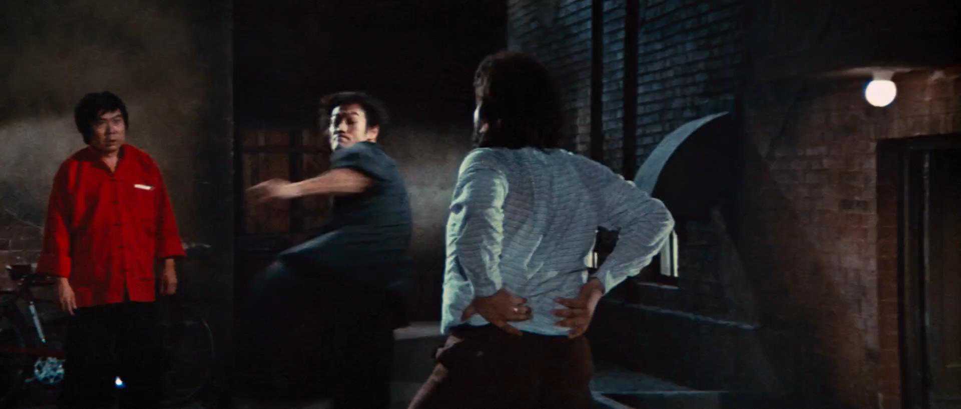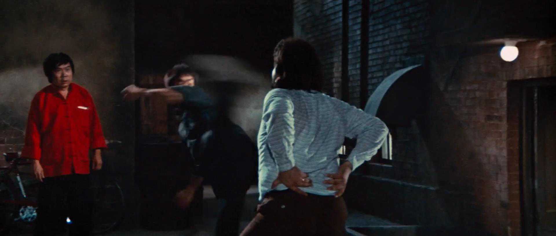 上个场景各自自报家门之后,欲展示功夫。但混混上门闹事,回餐馆应对。便有了此与混混后院搏斗场景。