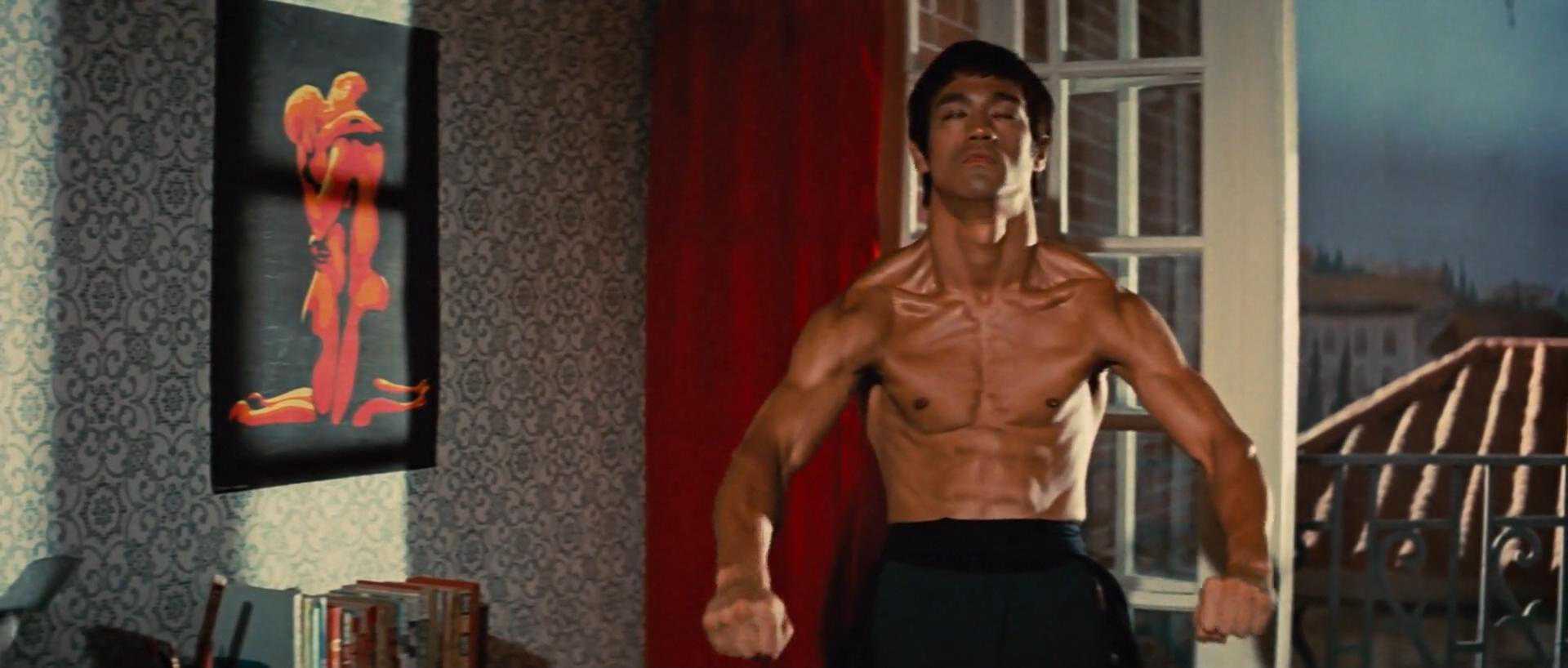 这一组动图看起来有点儿像作秀,就是李小龙借助电影的形式,秀出自己的完美身形。但,完全不是。有多年健身经验的朋友一定知道,肌肉量并不是越多越好:光是太大的维度,在外形轮廓上就已经限制身体的运动幅度和速率了;而过大的肌肉量也会带来更迅速、更严重的疲劳感。