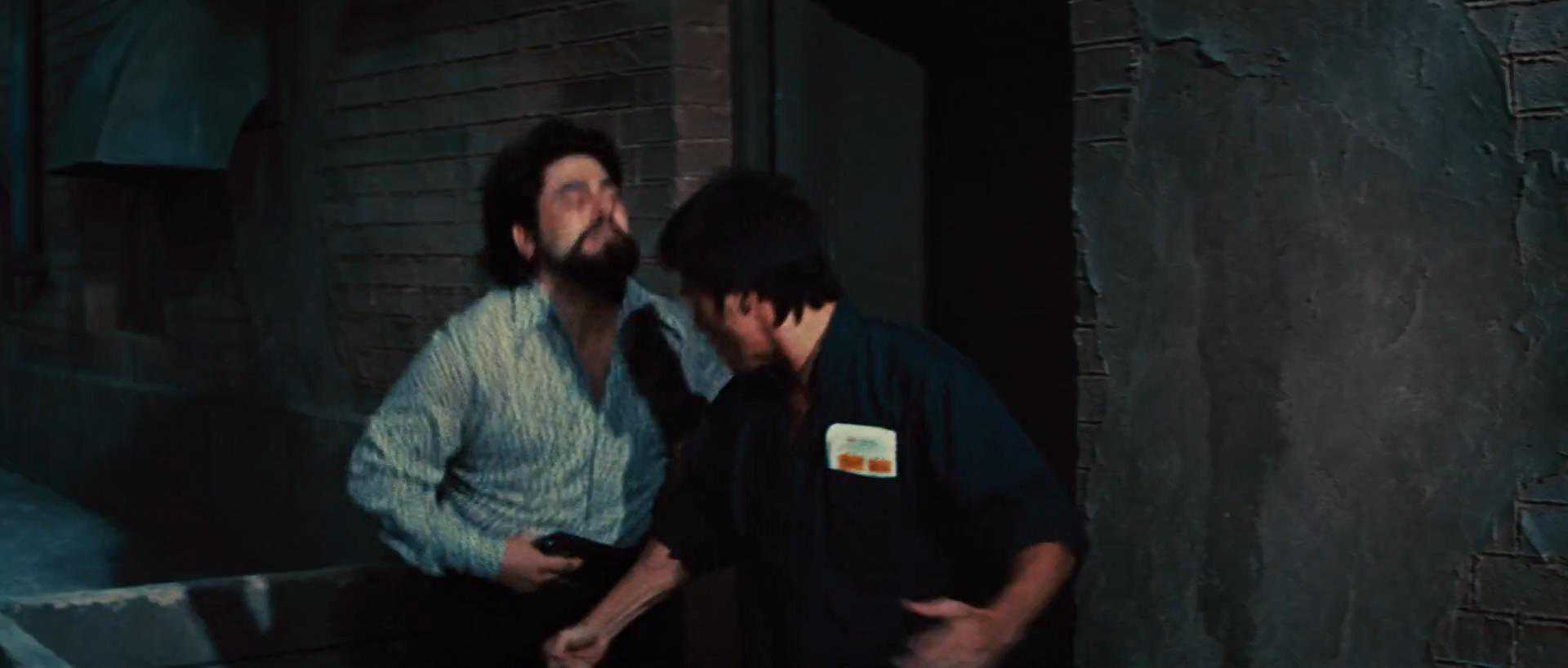 打斗开始,对峙,李的重心压的更低,对面明显不懂搏击技巧,右手直拳蓄力意图明显(虽然演的成分很大)。